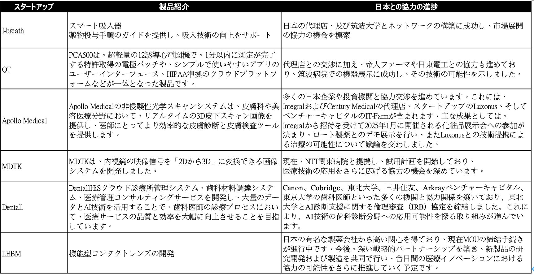 展示会期間中、台湾スタートアップは日本の病院、企業、学術機関、投資団体と交流を深め、医師による技術の実地試用とフィードバックを得ました。非侵襲性光学スキャナー、スマート吸入器、AI歯科管理システムといった一部の革新技術は、日本における医療診断や患者管理の効率向上に貢献する可能性を示しています。こうした具体的な協力は、両国の医療イノベーション能力を強化するだけでなく、日本市場に多様で利便性の高い医療ソリューションを導入する契機となっています。