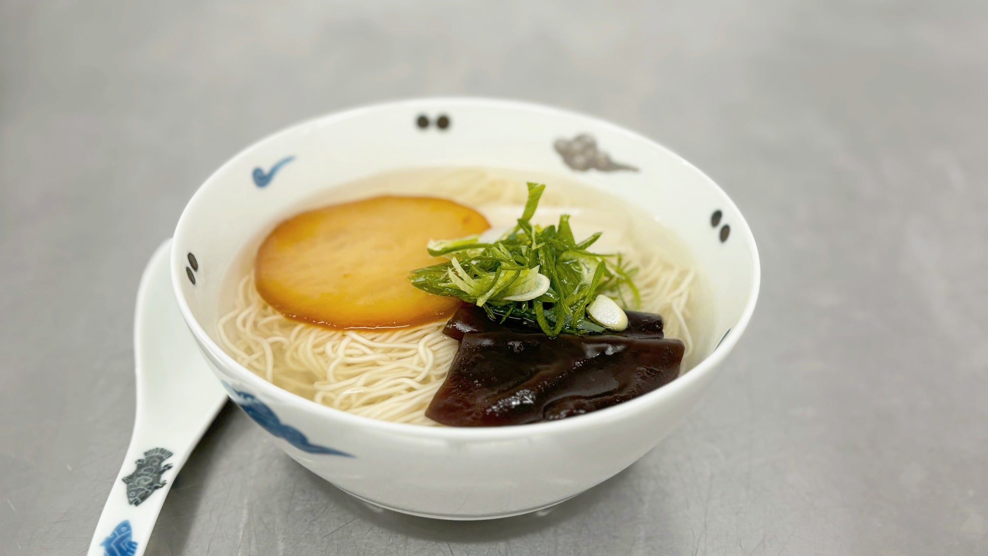 泉涌寺齋華さんのコースのシメにも登場する塩ラーメンをベースに、大根のほかには、岡山産の生きくらげ、高級すし店などで使われる肉厚の国産干瓢をトッピング。仏の教えに基づいて、可能な限り植物性の食材を使った泉涌寺オリジナルメニューを考案いただきました。陳皮(ちんぴ)というみかんの皮を乾燥させた生薬を使って煮込んだ大根は、開山俊芿律師もお気に召していただけることでしょう。