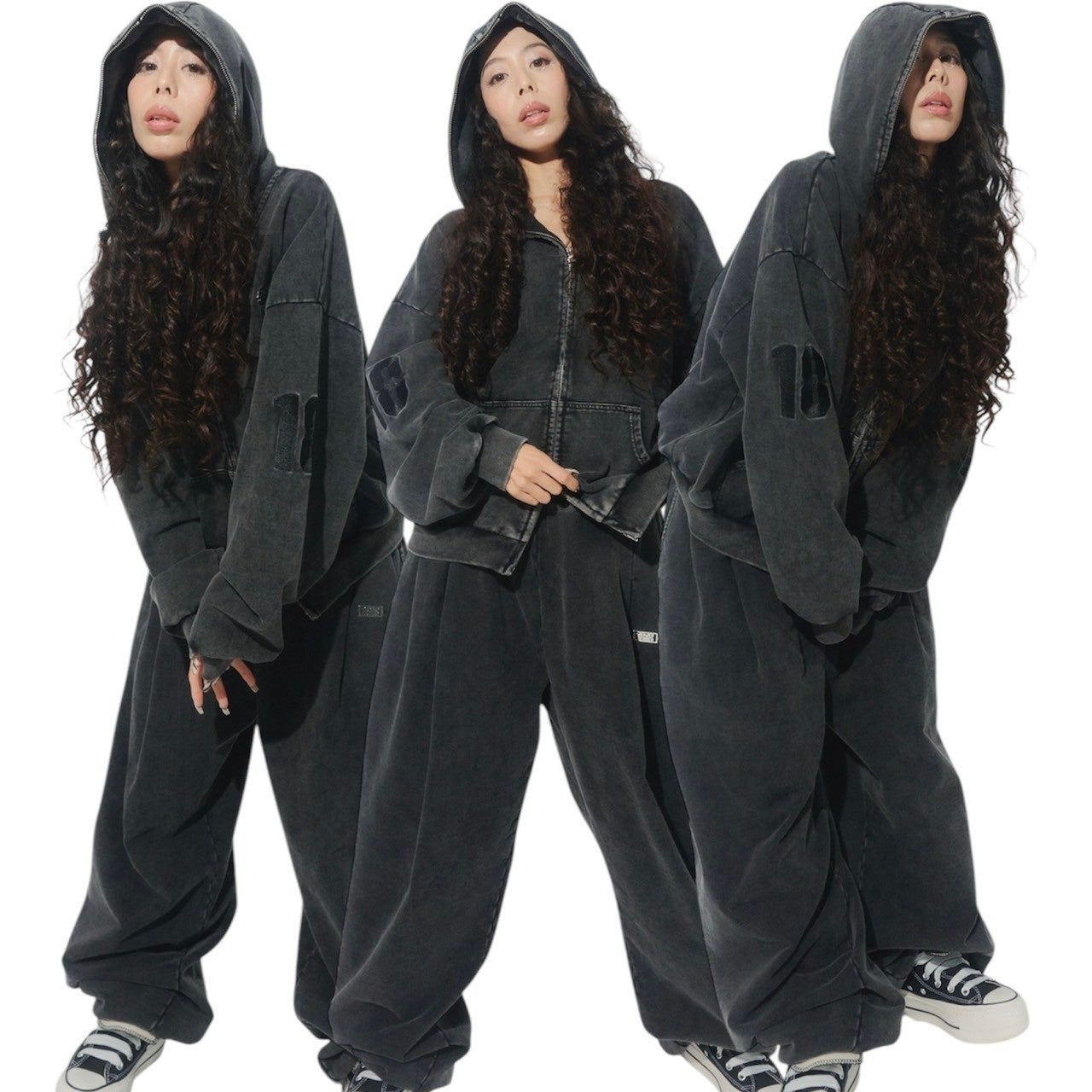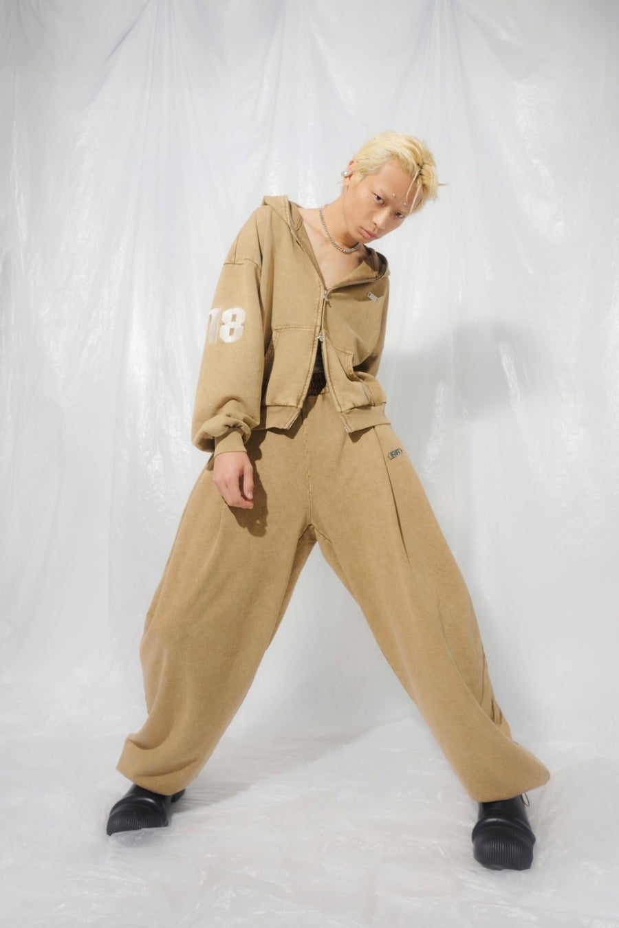 今回のコレクションの目玉は、1818が一からプロデュースしたスウェットシリーズ。自社生産によるウォッシュ加工やシルバーパーツを取り入れ、他にはないデザイン性と高い品質を実現しました。特に美しいシルエットにこだわり、スタイルアップを意識した設計は、カジュアルでありながらも洗練された印象を与えます。