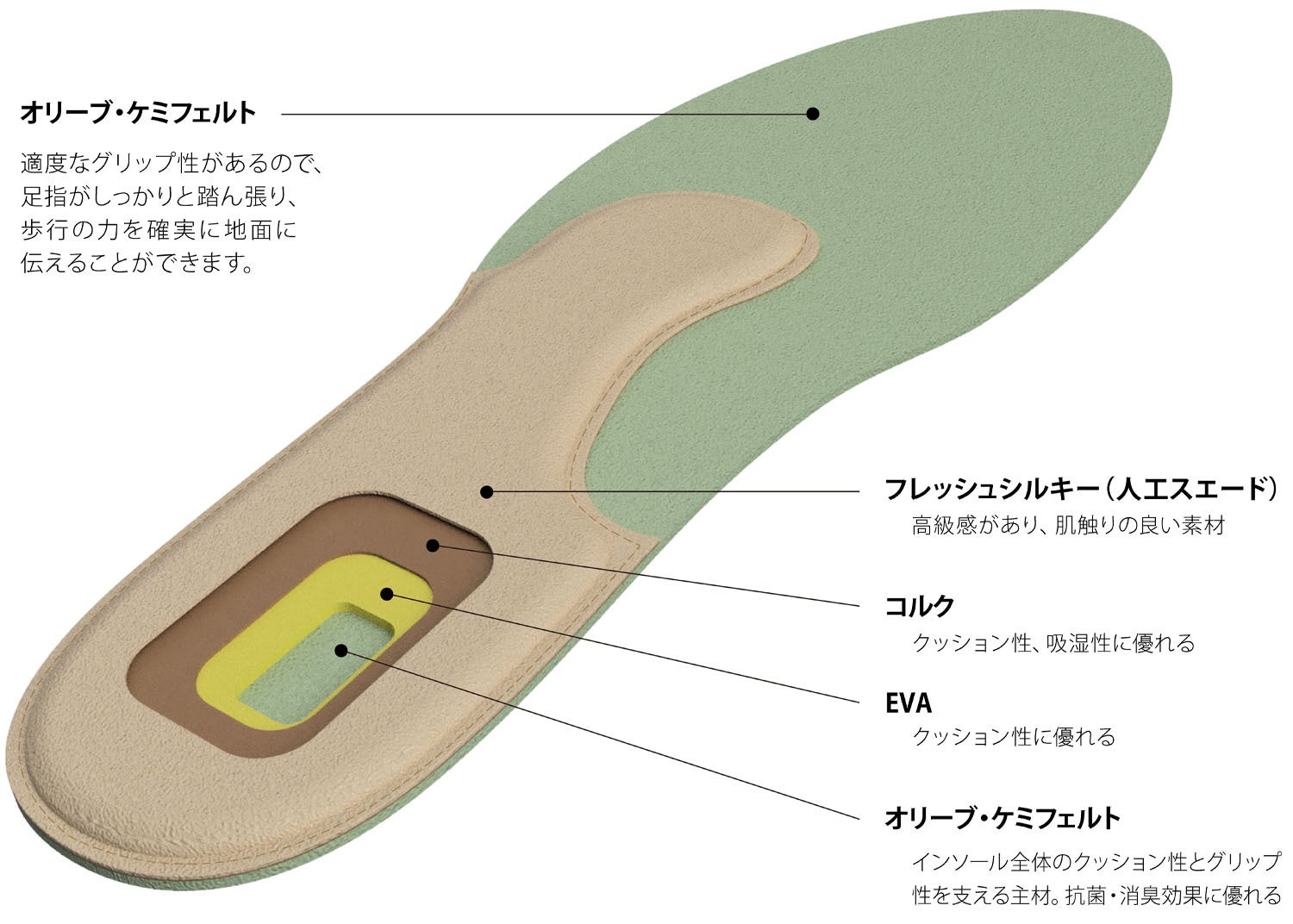 インソールの前方と底面は、程よいクッション性と程よいグリップ性をあわせ持つハイブリッド素材「ケミフェルト(2mm厚)」を使用することにより、足指が靴の中で滑ることなくしっかりと踏ん張り、歩行の力を確実に地面に伝えることができます。