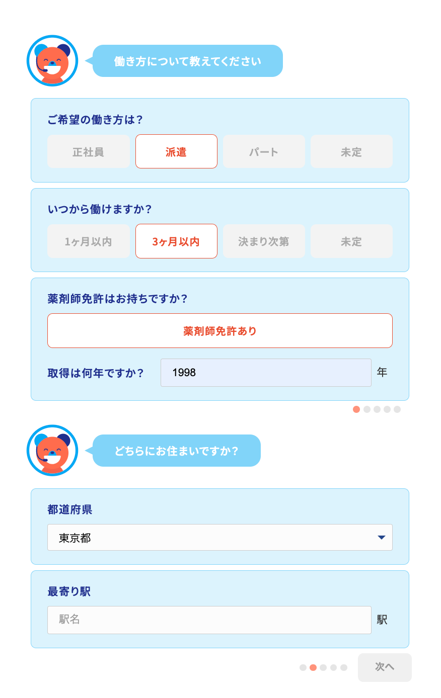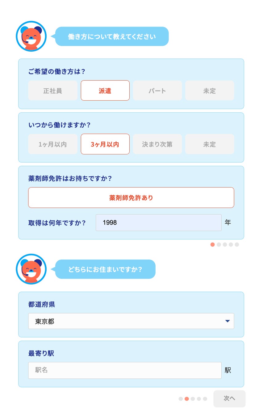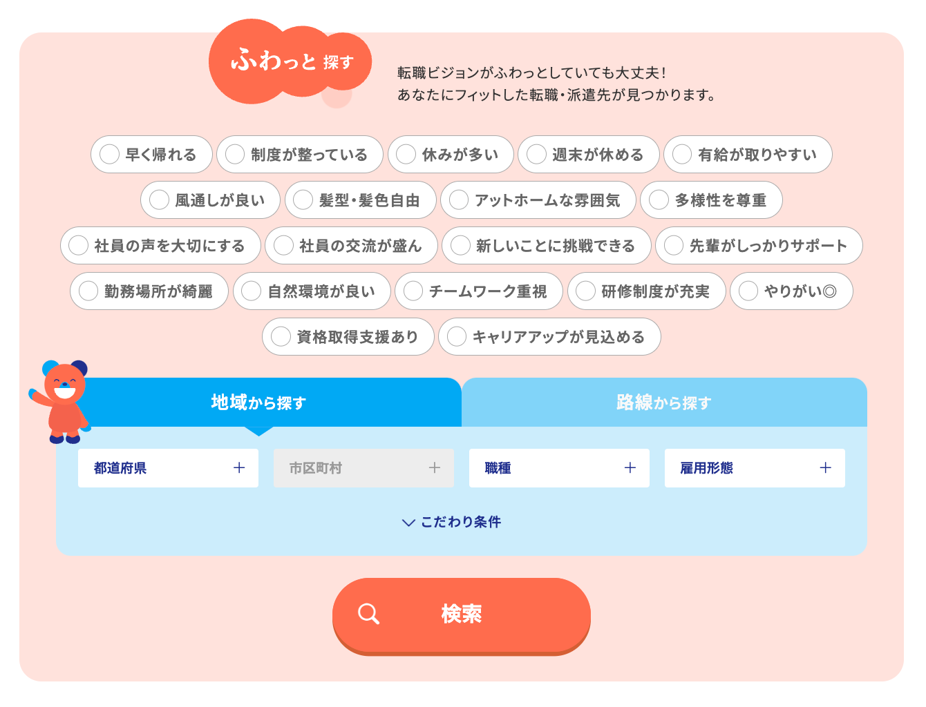 AIキャリアカウンセラー「りんくま」と薬局勤務経験者のキャリアカウンセラーがサポート。業界では珍しい思い描く「理想」が固まっていなくてもマッチングできる「ふわっと検索」も導入。