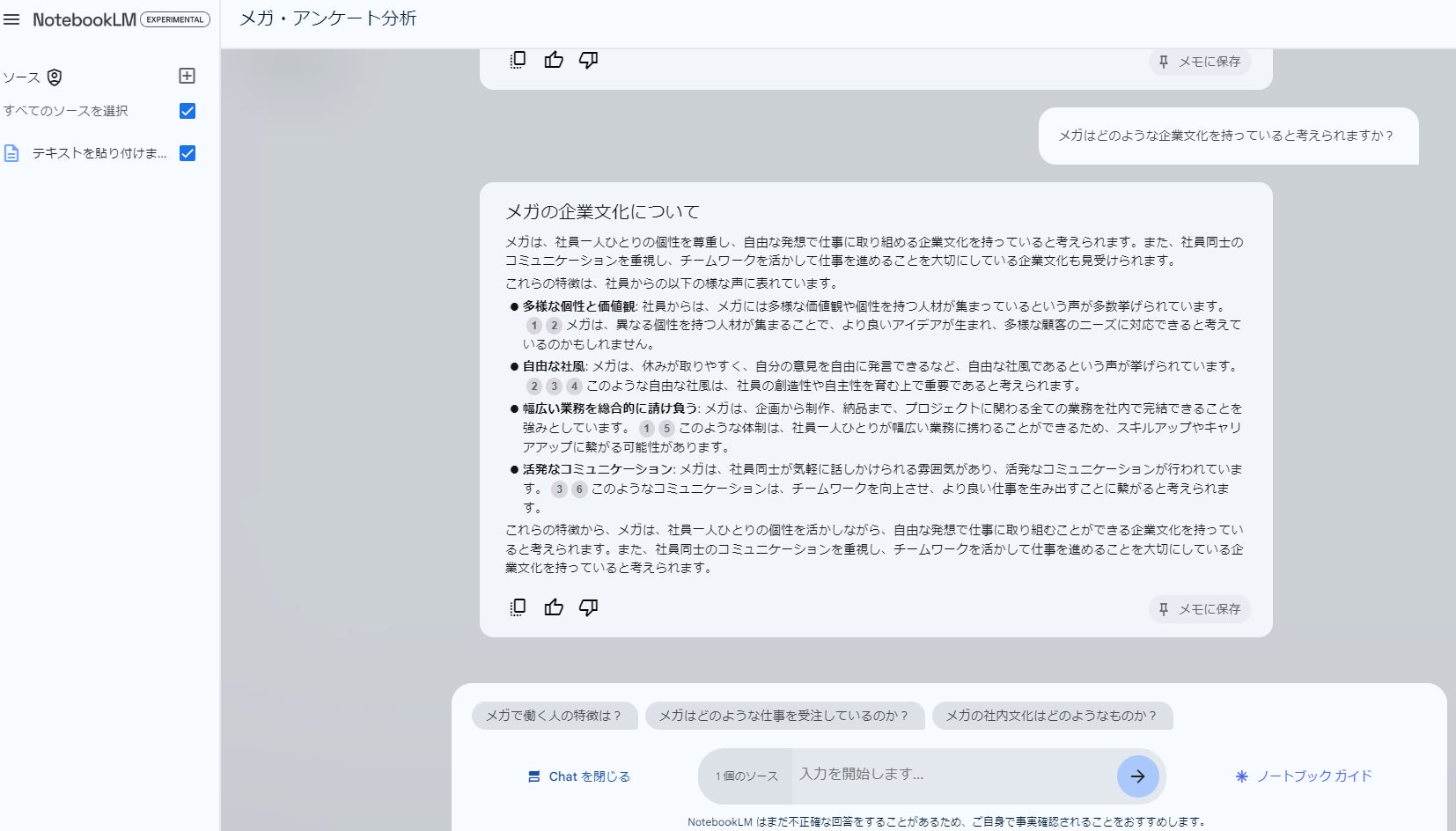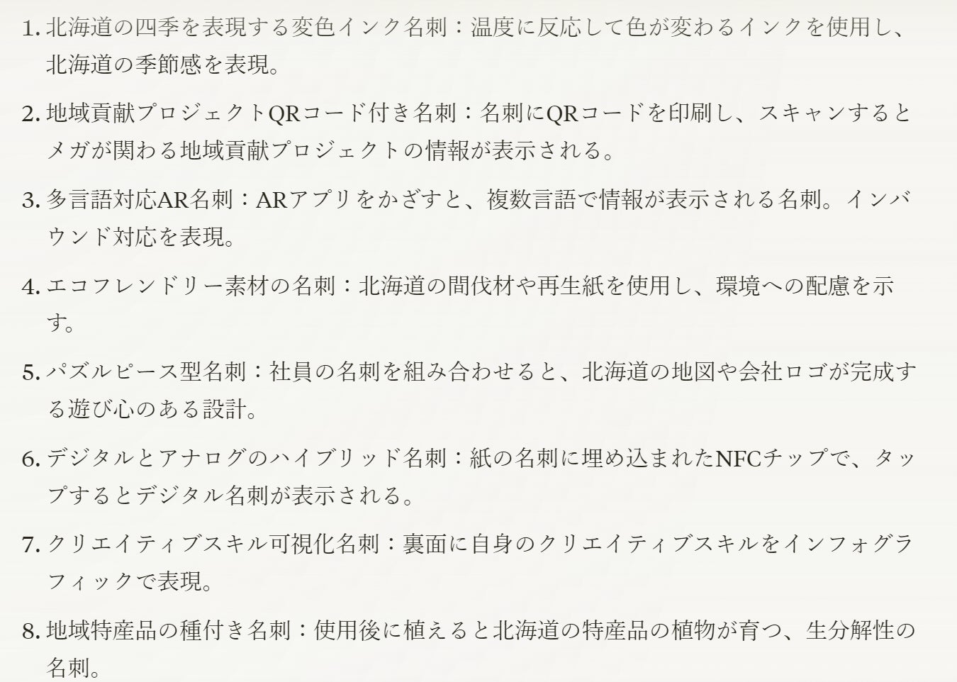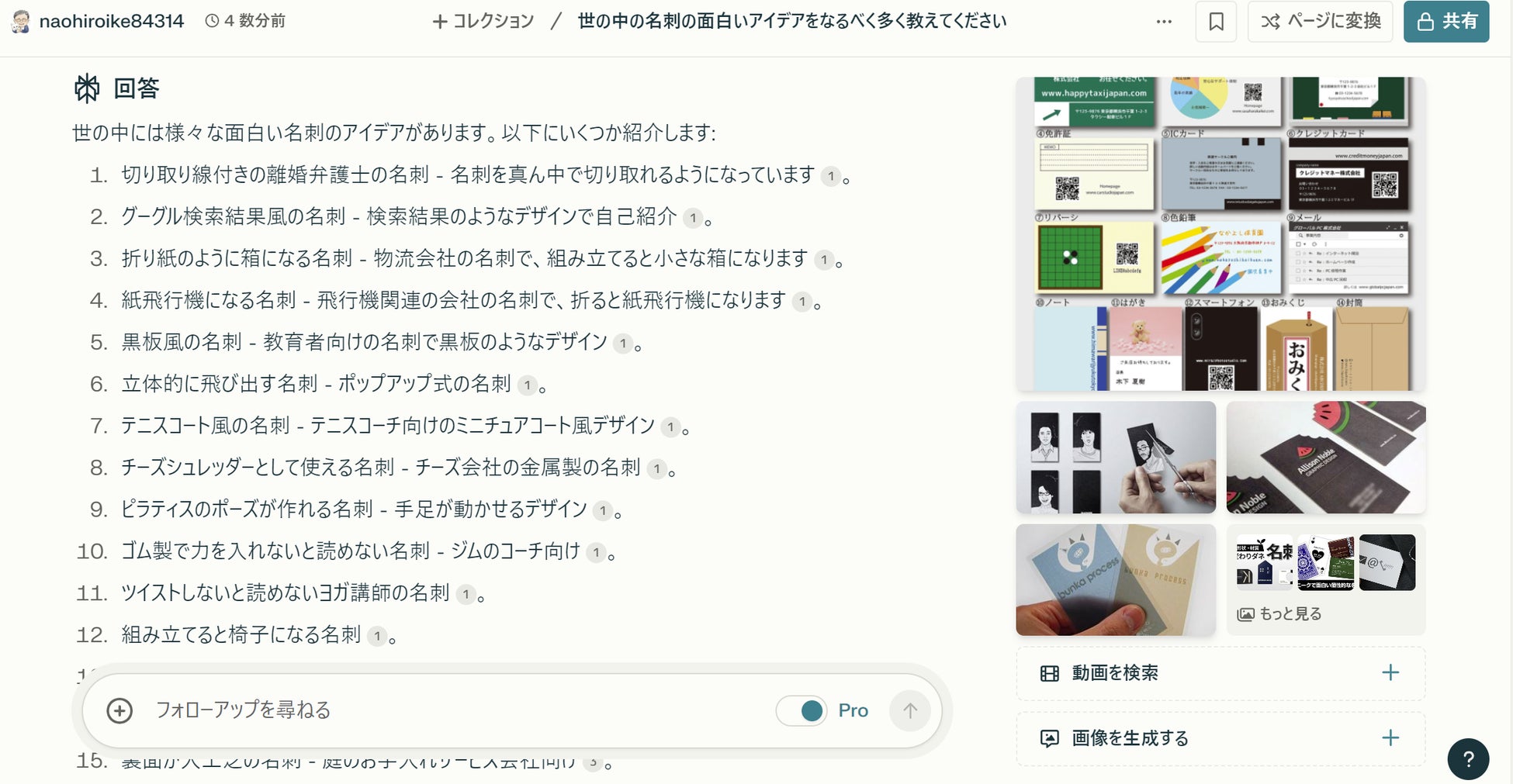 グループ会社の理念や特徴、世の中に存在するユニークな名刺などのWeb上での検索結果が、網羅的に引用付きで示される。