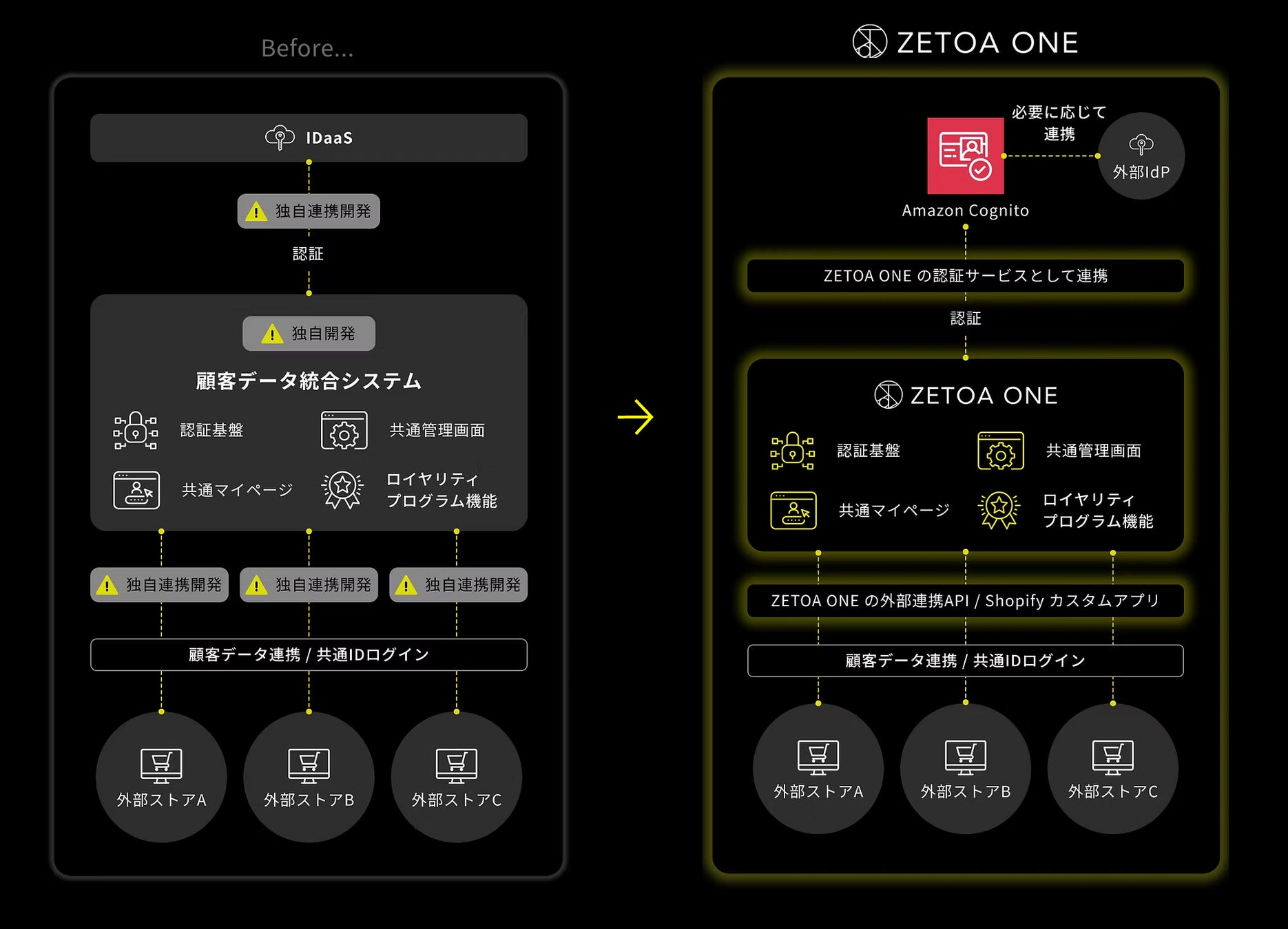 「ZETOA ONE」は、企業が展開する複数のオンラインストアやサービスを横断して、顧客情報・購入履歴・ロイヤリティプログラムなどのデータを一元管理・活用できる、統合ECフレームワークパッケージです。