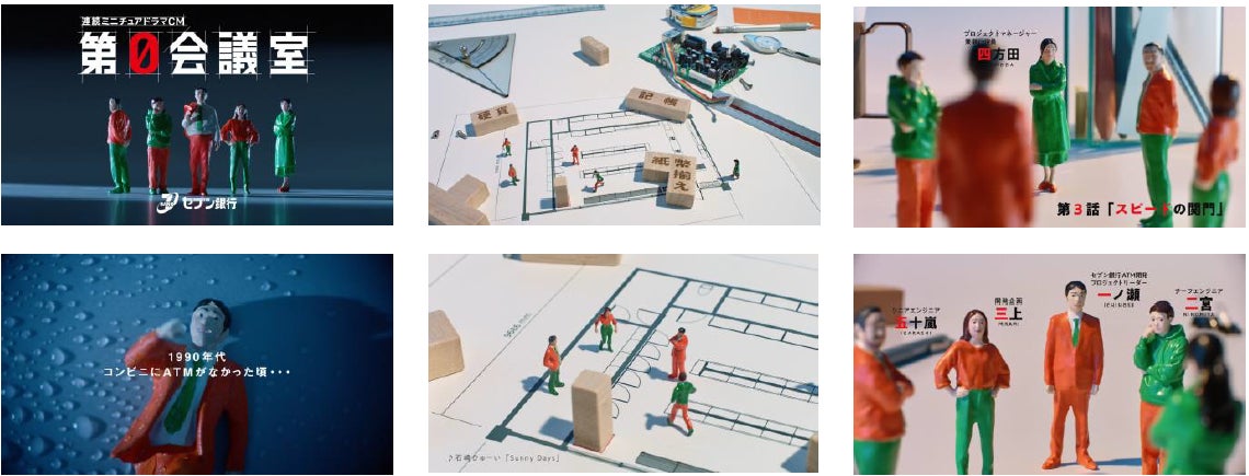 連続ミニチュアドラマCM『第0会議室』は、セブン銀行のATM開発プロジェクトを題材にした物語です。コンビニエンスストアが全国に普及し始めた90年代を舞台に展開していく本ミニチュアドラマCMでは、コンビニエンスストア内にATMを設置するという当時では無理難題と言われた開発に挑んでいくプロジェクトリーダーの一ノ瀬、チーフエンジニアの二宮、開発企画の三上、プロジェクトマネージャー兼執行役員の四方田、シニアエンジニアの五十嵐の5人の姿を描いています。