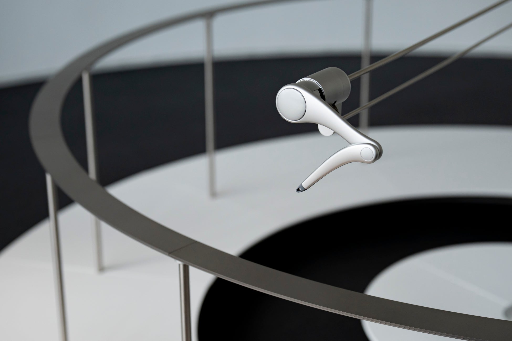 螺旋(らせん)の律動は、機械式腕時計を分解した際に出会った動力ぜんまいやひげぜんまいの存在から着想を得た作品です。薄い金属片が巻かれたその形は、単なる機構部品にとどまらず、時を駆動する力とリズムを宿す器のように思えました。そっと持ち上げると、手のわずかな動きを受け取り、今にも鼓動を始めるかのように揺れ動いたのです。複数のアームによって支えられる長くしなやかなステンレス板の螺旋構造。各アームはそれぞれが独立して伸縮することで螺旋に緊張や緩和をもたらします。また、そのたわみは全体に干渉し合うことで、刻一刻と新たな秩序を生み出し続けます。