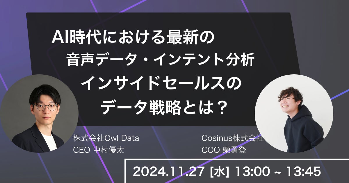 【11/27(水)】Owl Data、Cosinus共催ウェビナーを開催:AI時代における最新の音声データ・インテント分析 インサイドセールスのデータ戦略とは?