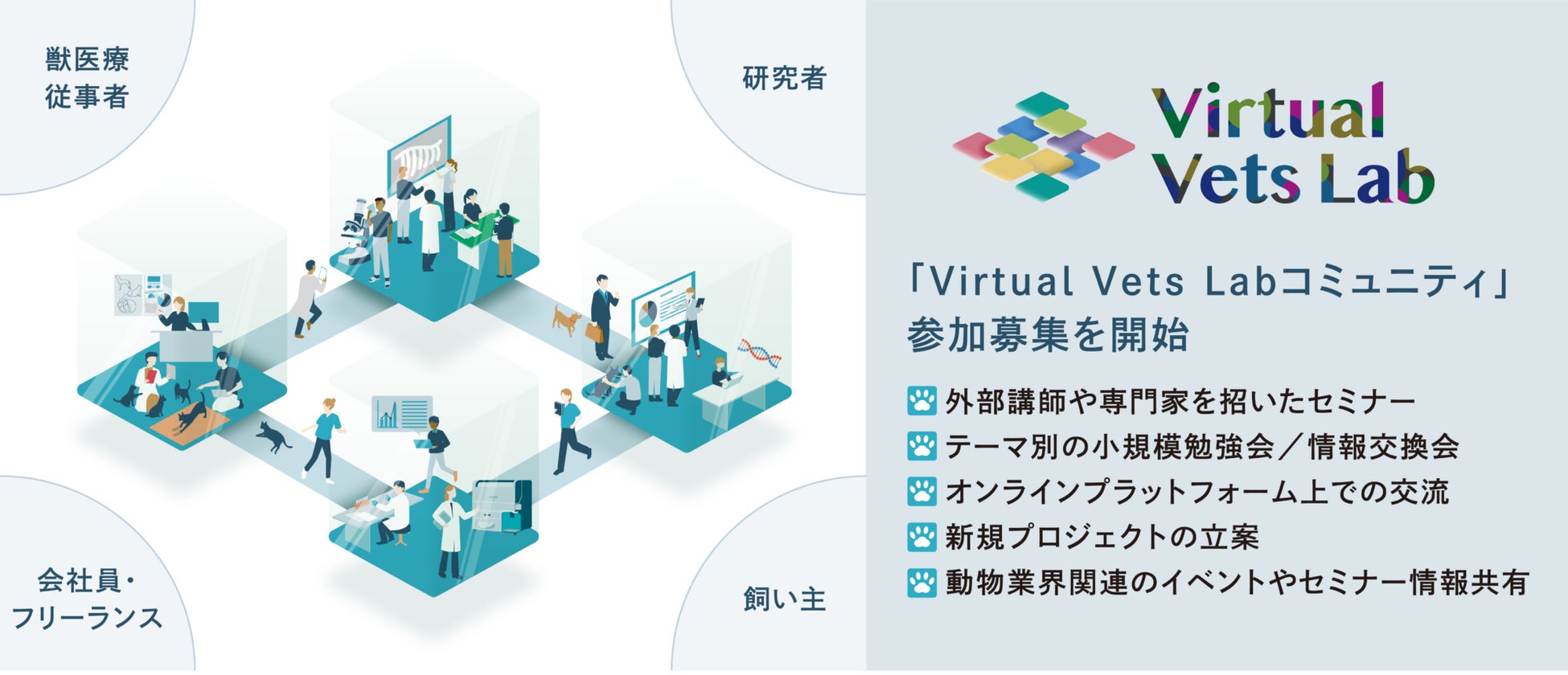 「Virtual Vets Labコミュニティ」は、獣医師、研究者、ビジネスマン、飼い主など、動物業界にイノベーションを起こしたいという想いを持つ方々が、気軽に繋がり、学び合いながら、新たな事業及び研究アイデアや協業の機会を生み出すことを目的としたオープンイノベーション・プラットフォームです。