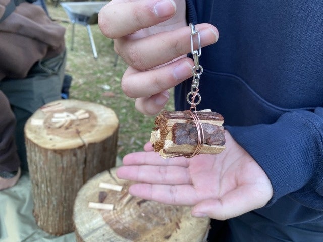 手のひらサイズのミニチュア薪束を作りキーホルダーに仕上げます。ランダムに束ねるか、ある一定の法則で薪を束ねるか。センスが光る体験です。