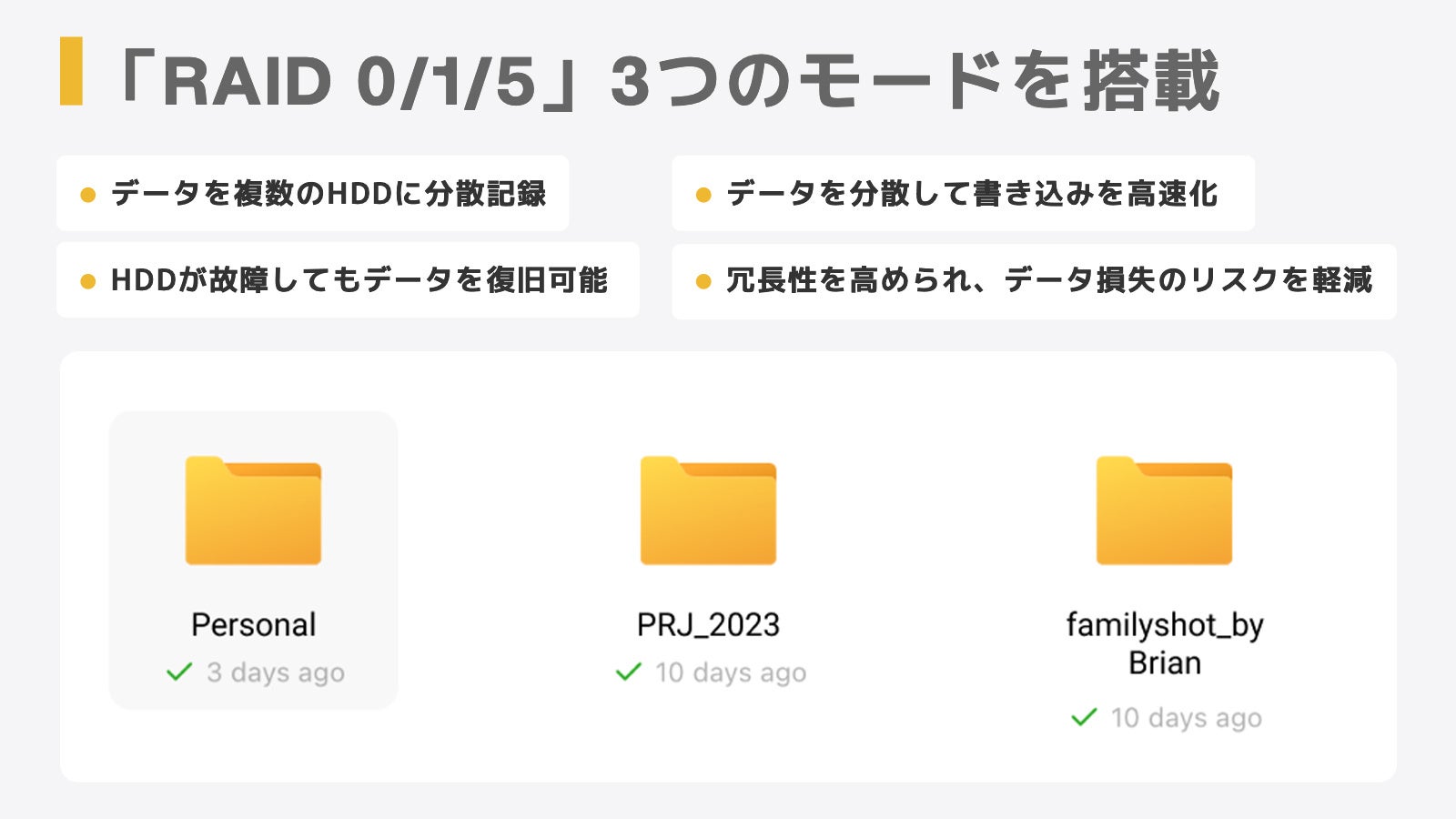 RAID 0/1/5の3モードを搭載し、高速アクセスと安全性を両立します。データを複数のHDDに分散記録することで、故障時の復旧や書き込み速度の向上、データ損失リスクの軽減を実現。重要なプロジェクトやフッテージの自動バックアップ、複数デバイス間のリアルタイム同期機能も備え、個人やチームのデータセキュリティを1台で確保します。