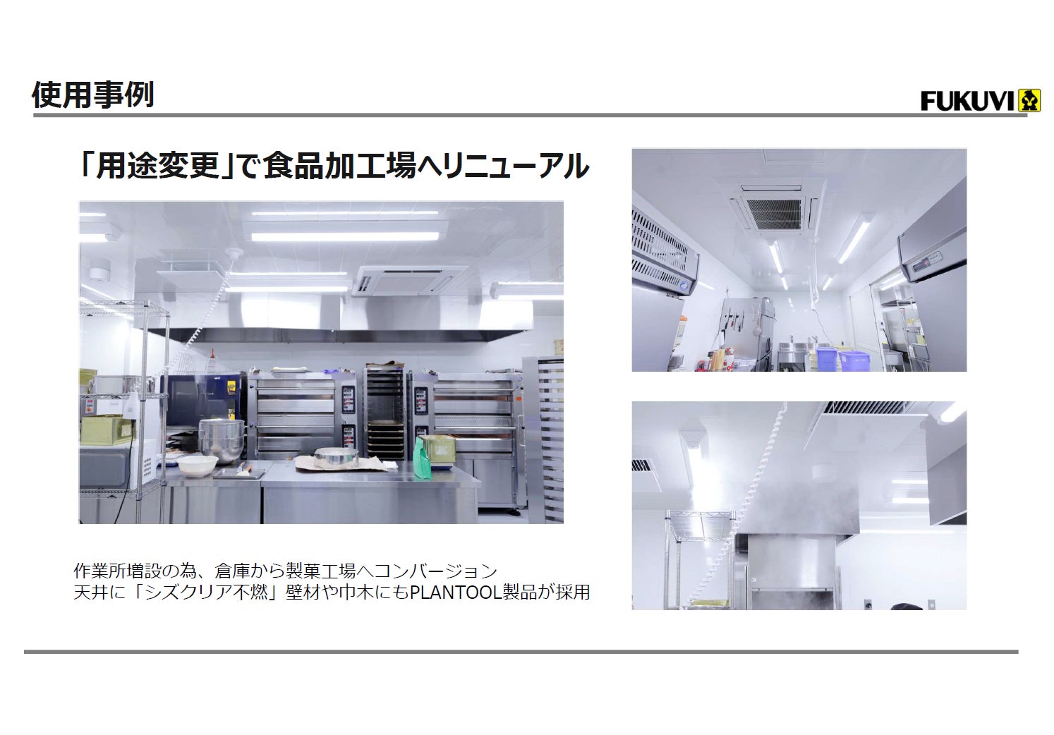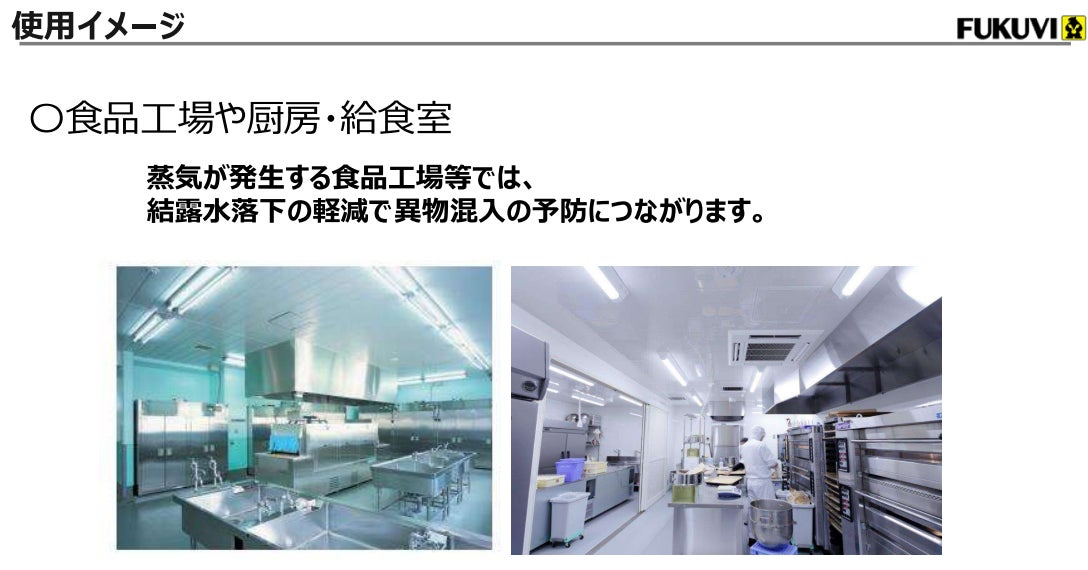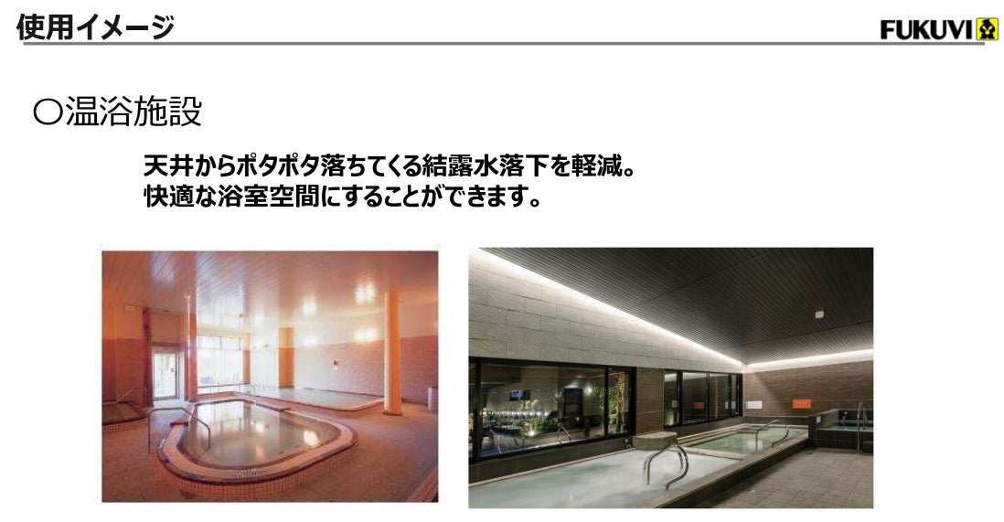 不燃認定材料であること、水滴落下の軽減や清掃性等から、これまでポタポタと雫が落ちてきて不快だった大浴場の天井や、蒸気が発生する食品工場等で異物混入につながる水滴落下を軽減する天井材として幅広い箇所での採用を見込んでおります。