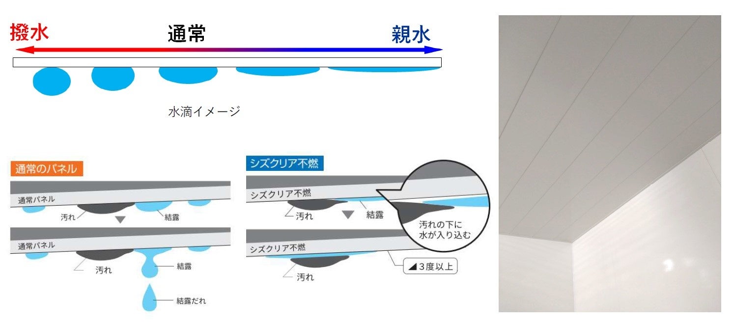 親水コーティングを付与したことで、パネルに付着した結露水は膜状に広がり、天井勾配に沿って流れるため、天井からの水滴落下を軽減することができます。また、広がった水膜は、付着している汚れの下側に入り込み、汚れを一緒に流すセルフクリーニング効果も発揮します。