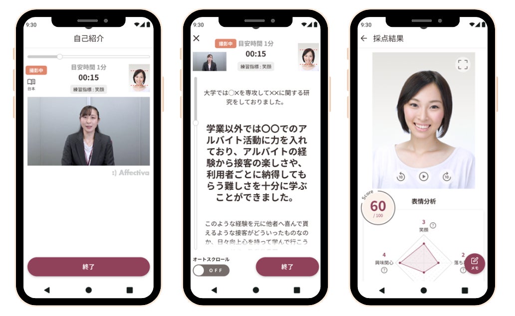 「カチメン!」は表情感情分析AI「Affdex」(※1)と音声感情解析AI「Empath」(※2)が面接練習時の感情(表情や印象)、話し方、台本類似度などを高精度に解析し、面接での改善点を客観的にフィードバックします。アプリ利用者からは手軽に面接対策できる点や実践に即した練習内容などに好評を得ています。