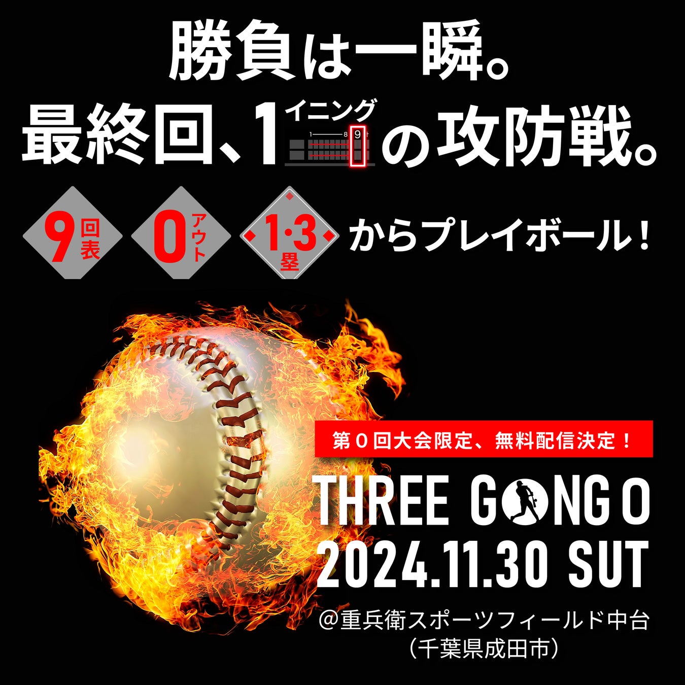 今までの野球の概念を覆す、新たな野球イベント「THREE GONG」の第0回大会を2024年11月30日(土)に重兵衛スポーツフィールド中台 野球場にて開催いたします。