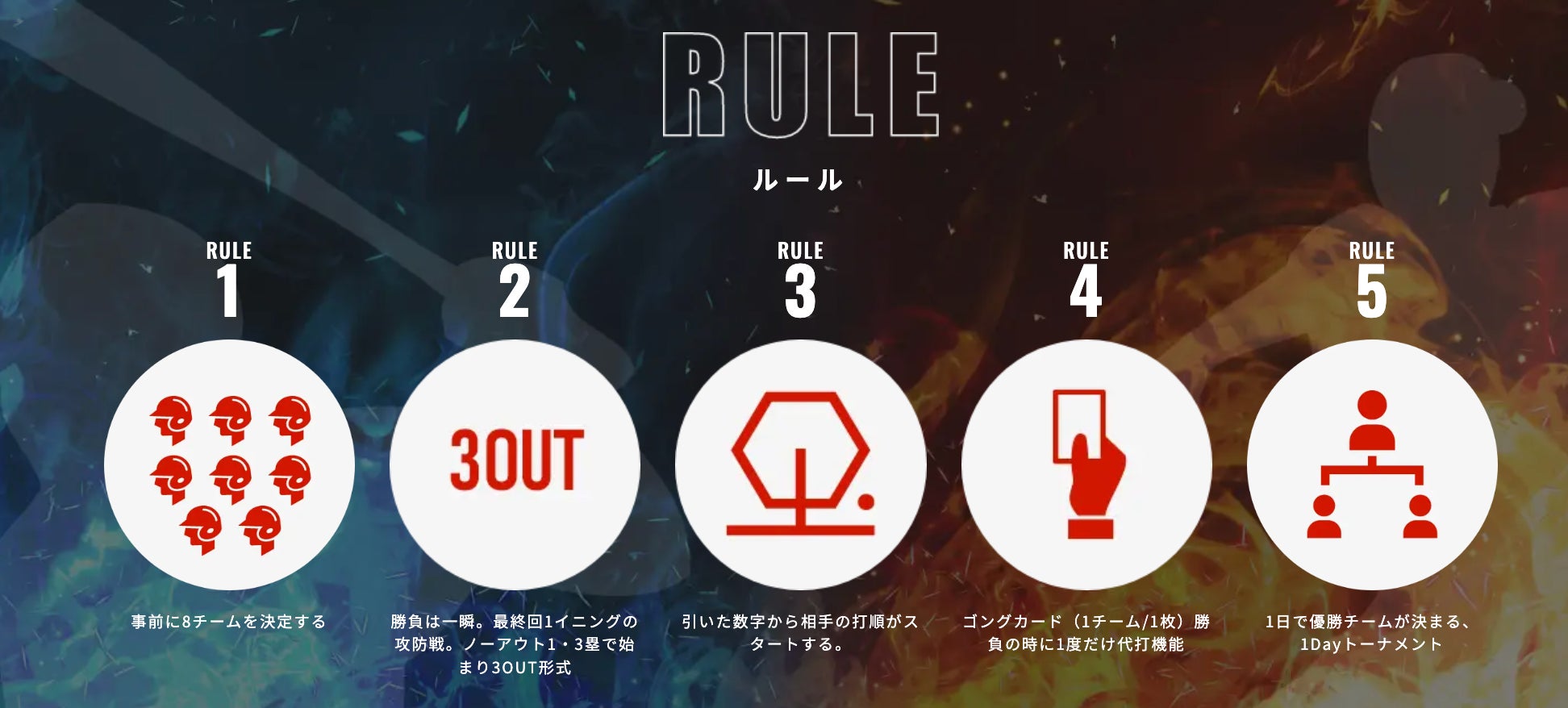 【THREE GONG(スリーゴング)】には今までの野球の概念を覆し、最短である「3OUTで勝者が決まる」という意味が込められています。
