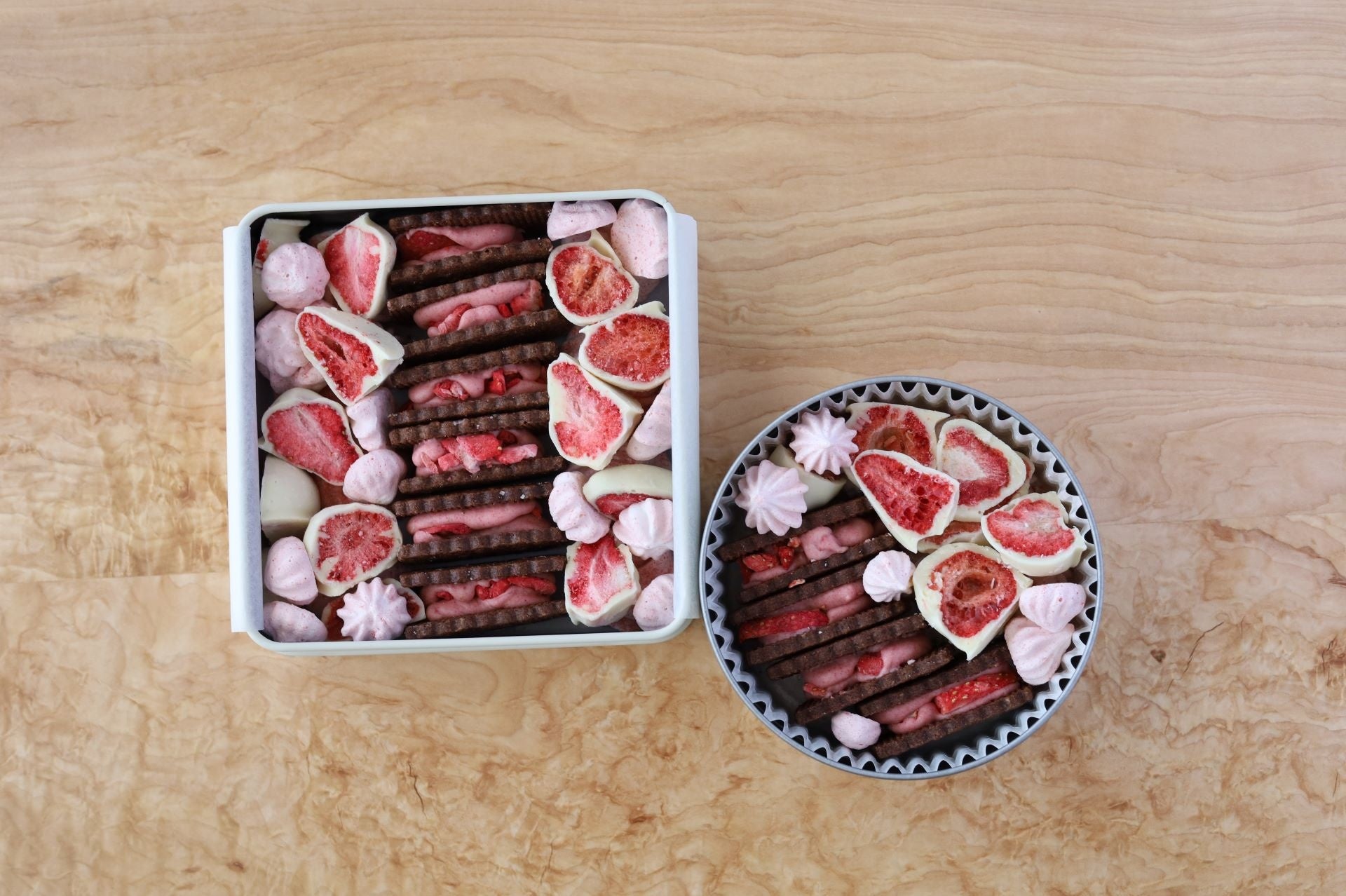 いちごのお菓子が詰まったキュートなクッキー缶です。チョコサンドクッキーやサクサクいちごのホワイトチョコ掛けやメレンゲクッキーなど、チョコレート専門店ならではの贅沢なお菓子で、開けた瞬間の甘酸っぱいトキメキも楽しんでくださいね。