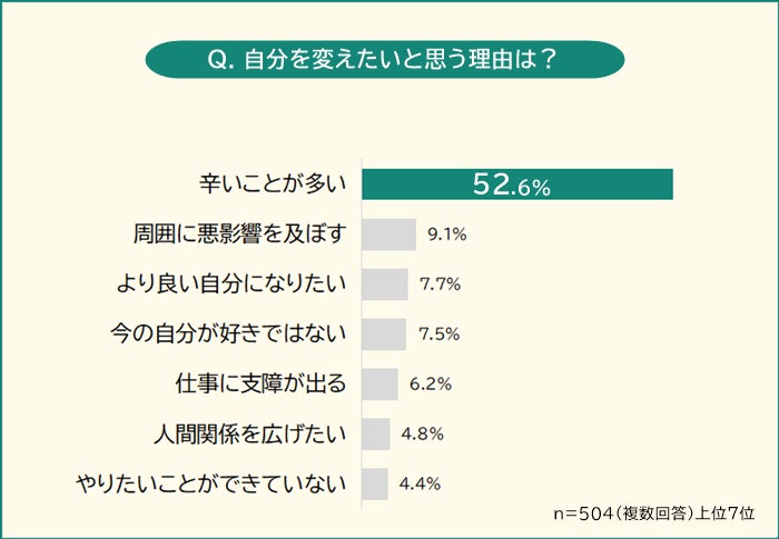 自分を変えたいと思う理由の圧倒的1位は「辛いことが多い(52.6%)」で、全体の半数以上を占めました。日常生活でストレスや困難を感じているために、自分を変えたいと感じている人が多数。