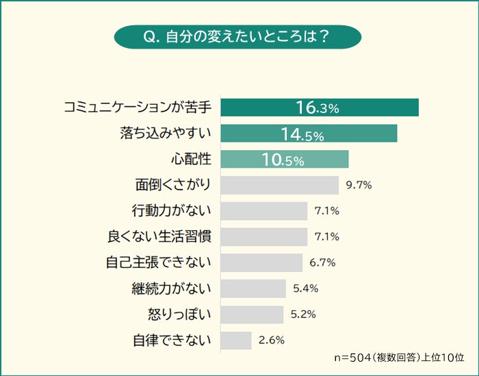 全国の男女504人に「自分の変えたいところ」を聞いた結果、1位は「コミュニケーションが苦手(16.3%)」でした。2位「落ち込みやすい(14.5%)」、3位「心配性(10.5%)」となっています。