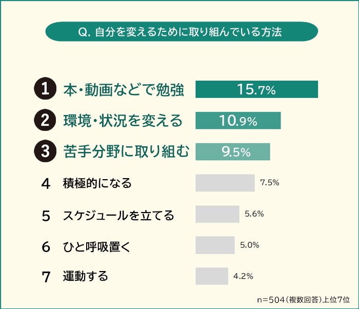 「自分を変えるために取り組んでいる方法」を聞いたところ、もっとも多かった回答は、「本・動画などで勉強(15.7%)」でした。次ぐ2位は「環境・状況を変える(10.9%)」、3位は「苦手分野に取り組む(9.5%)」となっています。