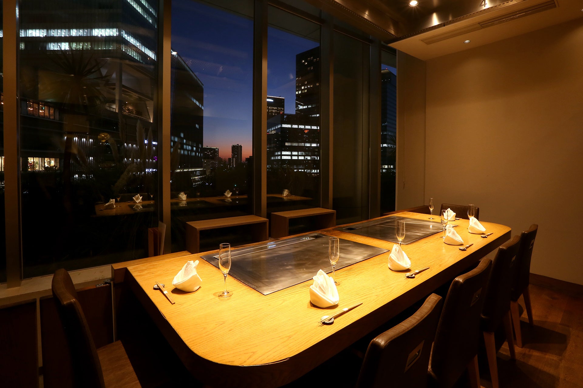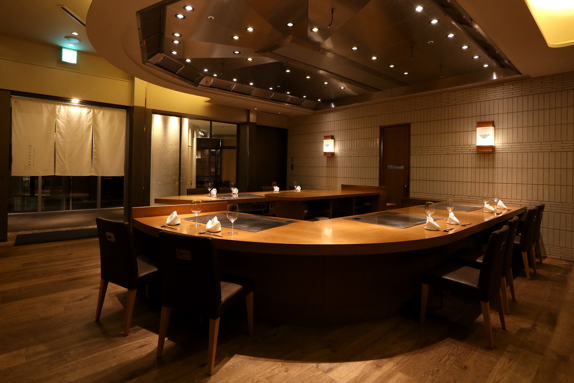 村かみではカウンター・テーブル個室、座敷にいたるまで全席に鉄板が備え付けられており、鉄板ごとに専属の焼き師がついてお客さま一人ひとりをおもてなし。