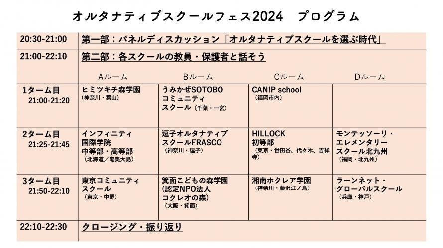 第1部では、オルタナティブスクールの魅力や教育の未来についてのパネルディスカッションを実施します。第2部では、各スクールの教員や保護者と直接対話する機会があり、実際にオルタナティブスクールではどのような学びが起こっているのか、先輩保護者たちはスクールをどうやって選んだのか、などのポイントについて知ることができます。