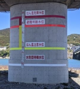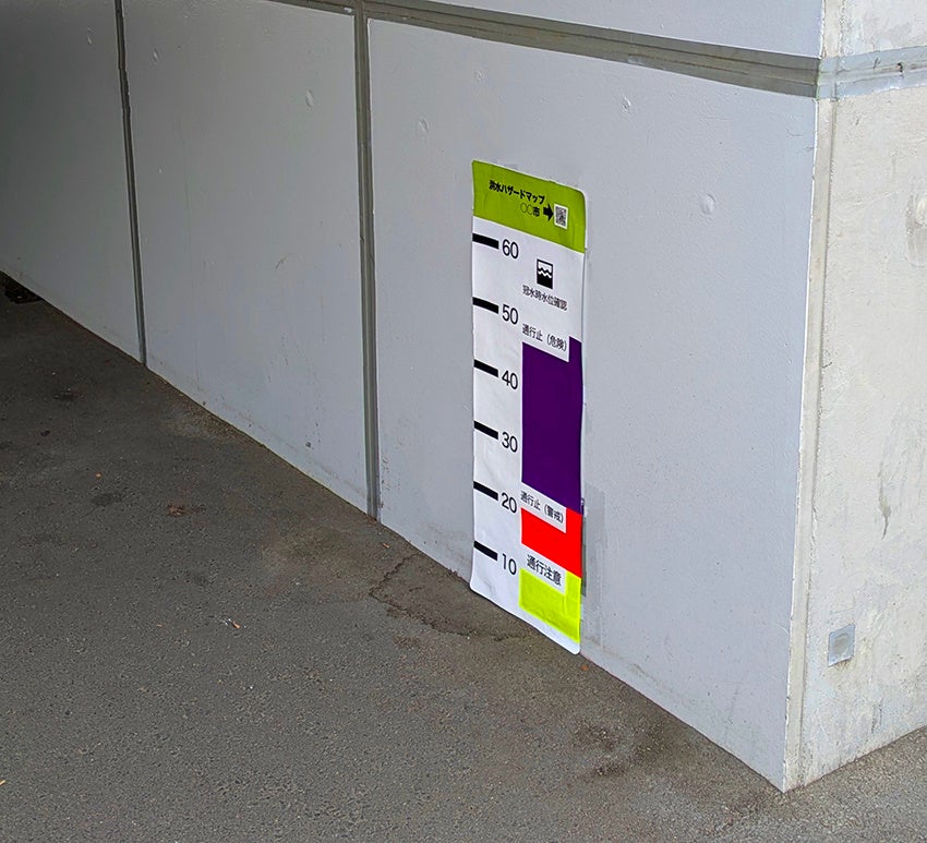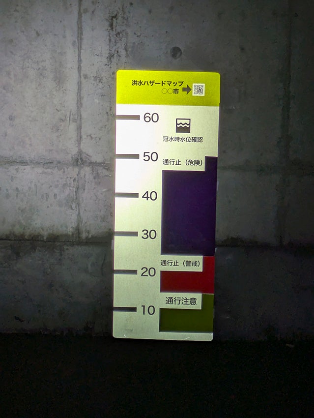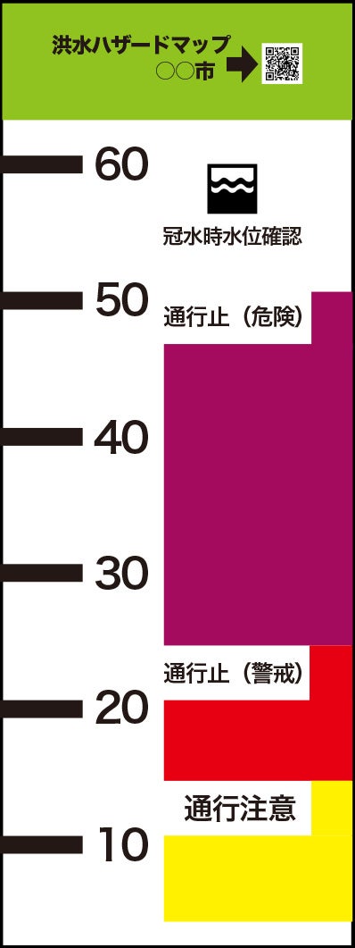 * 水深の明示: 冠水時の水深を目盛と色彩で分かりやすく表示します。