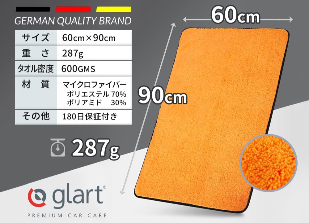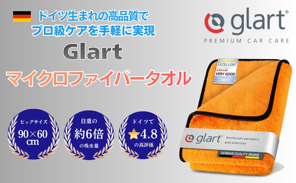 ドイツで開発された最高品質:Glart(グラート)はカーケア専門のドイツメーカー。「1枚で車全体を拭き上げる」というコンセプトのもと、改良を重ねて作り上げました。Glart(グラート)マイクロファイバータオルはとてもやわらかく、あなたの愛車を傷つけない。独自の製法で糸くずが出ない、拭きあとが残らないので二度拭きなし。拭き上げ時間を短縮できます。
