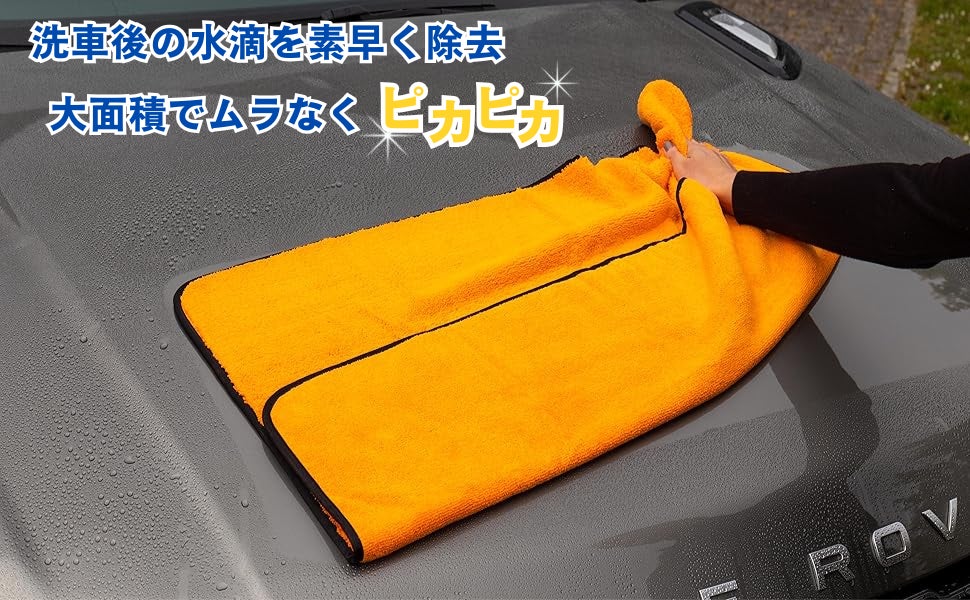 車全体を拭くのにタオル交換をする必要がないように、大きなタオルが欲しいというアイディアから生まれました。また、ボンネットや屋根に簡単に広げられ、一度拭くだけで乾かせるサイズを提供したいと考えました。ぜひ一度ご利用になってください。