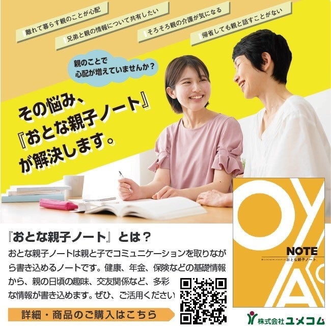 創業より超高齢社会を取り巻くリスクから、「家族・仕事・自分自身」と何も諦めることなく、豊かな人生を成就させる社会づくりを目指している、株式会社ユメコム(本社:京都府京都市中京区 代表:橋本 珠美)は現役世代が抱える介護離職を解決すべく「おとな親子ノート」を発売いたしました。