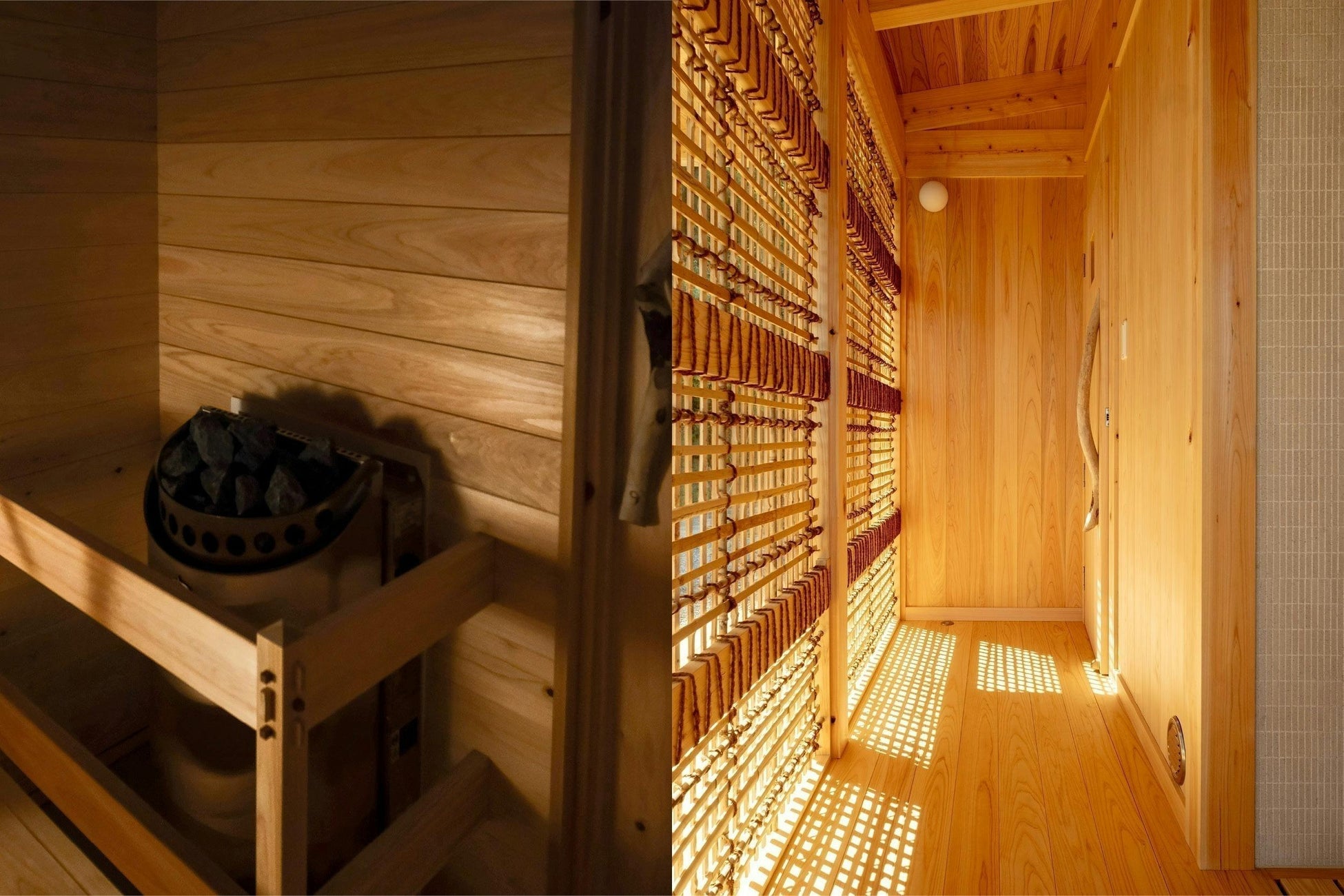 伝統構法の石場建てで建てられたプライベートサウナ棟は、温かみと趣が漂う造りで、リラックスできる空間を提供します。