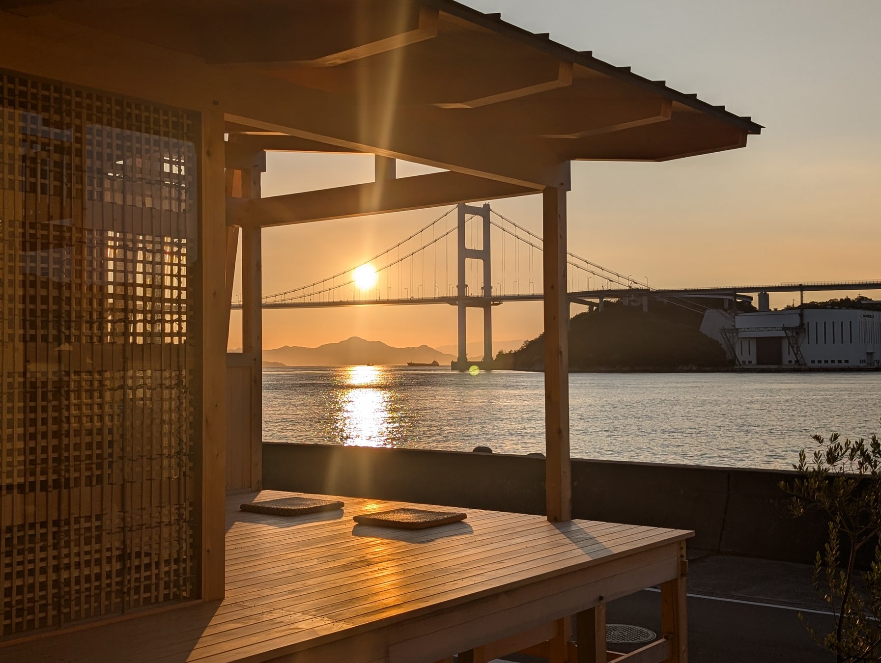 穏やかな瀬戸内海を眺める宿泊棟からは、橋を望む美しい景色が広がり、時間の流れがゆっくり感じられる環境です。