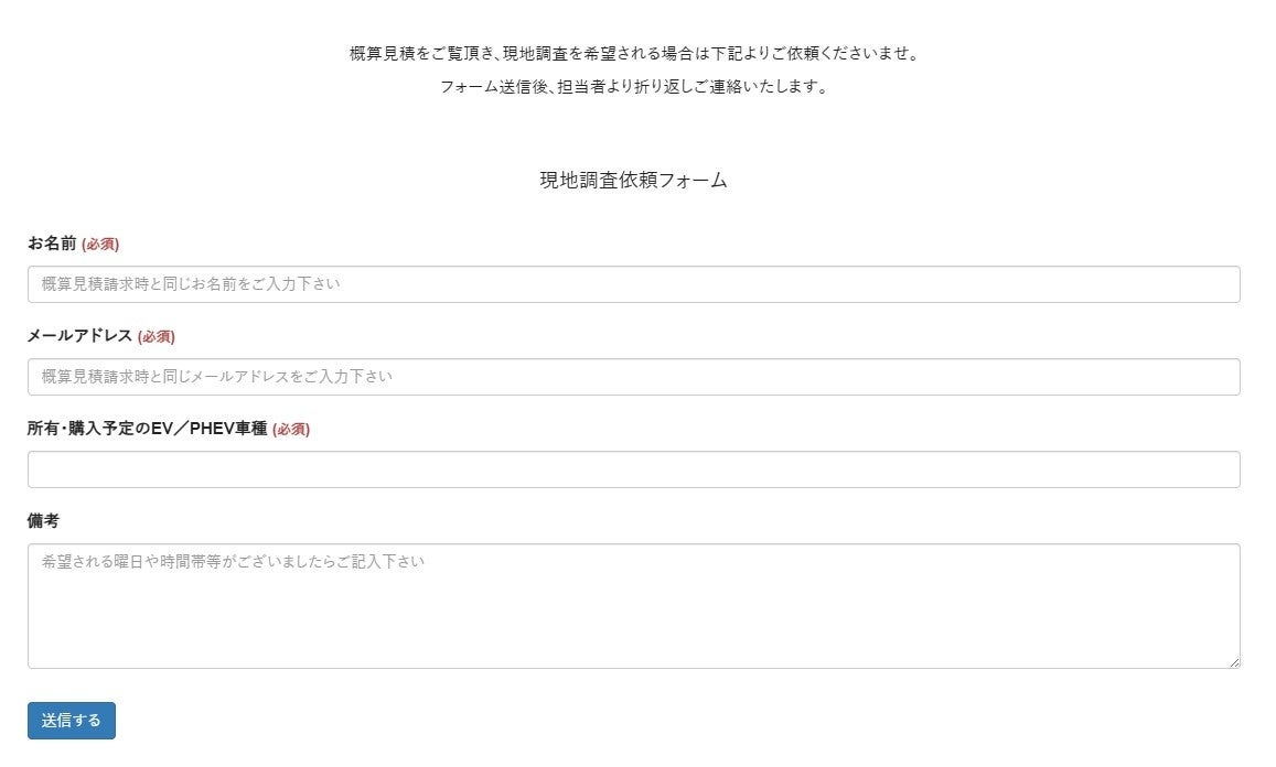 概算見積にご了承頂いた後、現地調査を希望される場合は、概算見積PDF内または概算見積のご送付メール本文リンクから、お申込み頂くことができます。