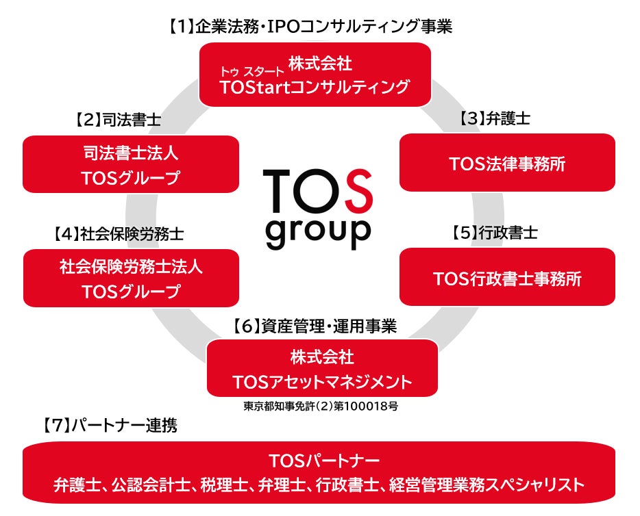 TOSグループは、司法書士を主なメンバーとし、弁護士、公認会計士、税理士、社会保険労務士等が 在籍する、企業法務、IPO・内部統制構築支援に特化したスペシャリスト集団です。上場企業及びIPO準備会社(スタートアップ)等の関与先は1000社を超えており、毎年継続的に様々な業種における上場支援実績があります。特にグループ内の司法書士法人TOSグループは、スタートアップ等に関する企業法務、IPO・内部統制構築支援分野では、司法書士業界トップクラスの規模と実績があります。