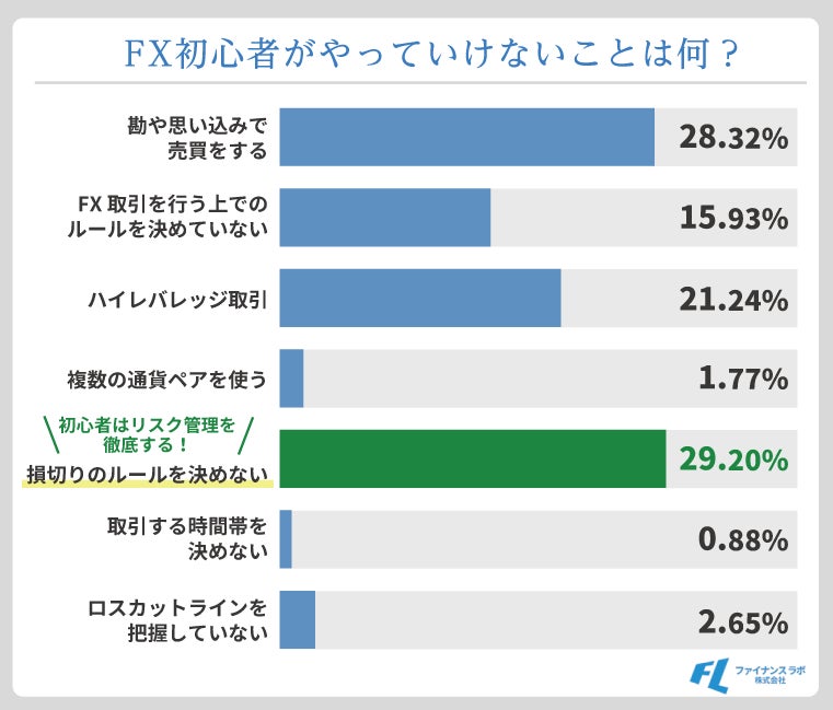 「FX初心者がやっていけないことは何?」と質問したところ、約30%の人が「損切りのルールを決めないこと」と回答。