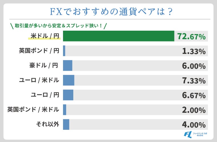 「おすすめの通貨ペアは?(複数回答可)」と質問したところ、約73%の人が「米ドル/円」と回答。