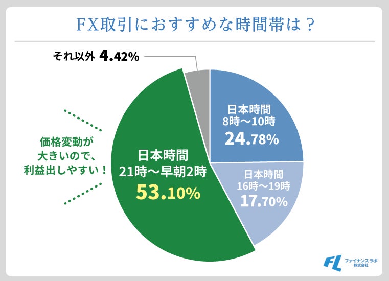 「取引におすすめな時間帯は?」と質問したところ、約53%の人が「日本時間21時~早朝2時」と回答。