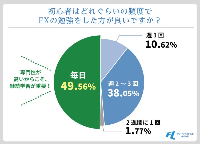 「初心者はどれぐらいの頻度でFXの勉強をした方が良いですか?」と質問したところ、約50%近くの人が「毎日」と回答。