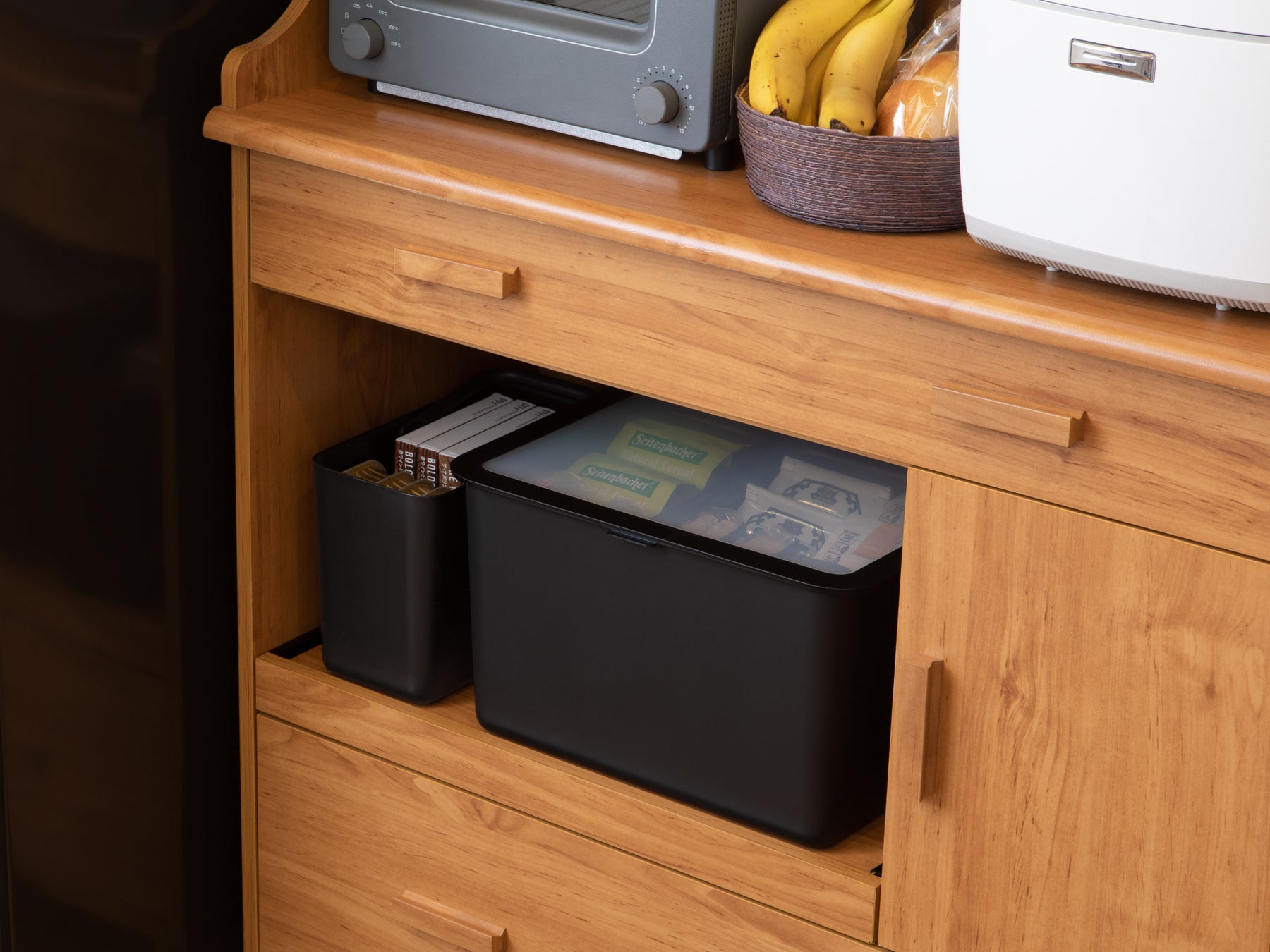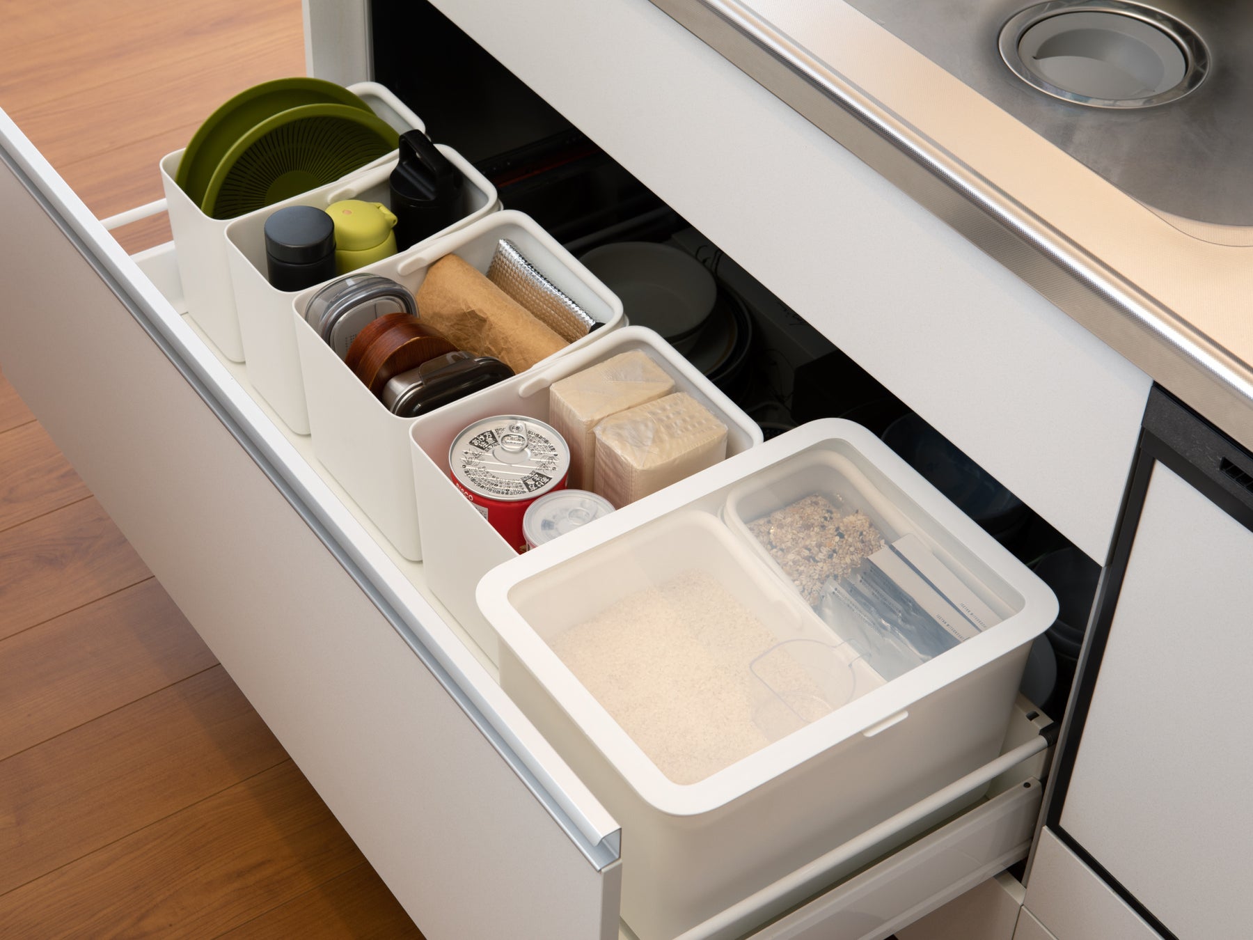 システムキッチンの引き出しや食器棚に設置しやすいサイズに設定。