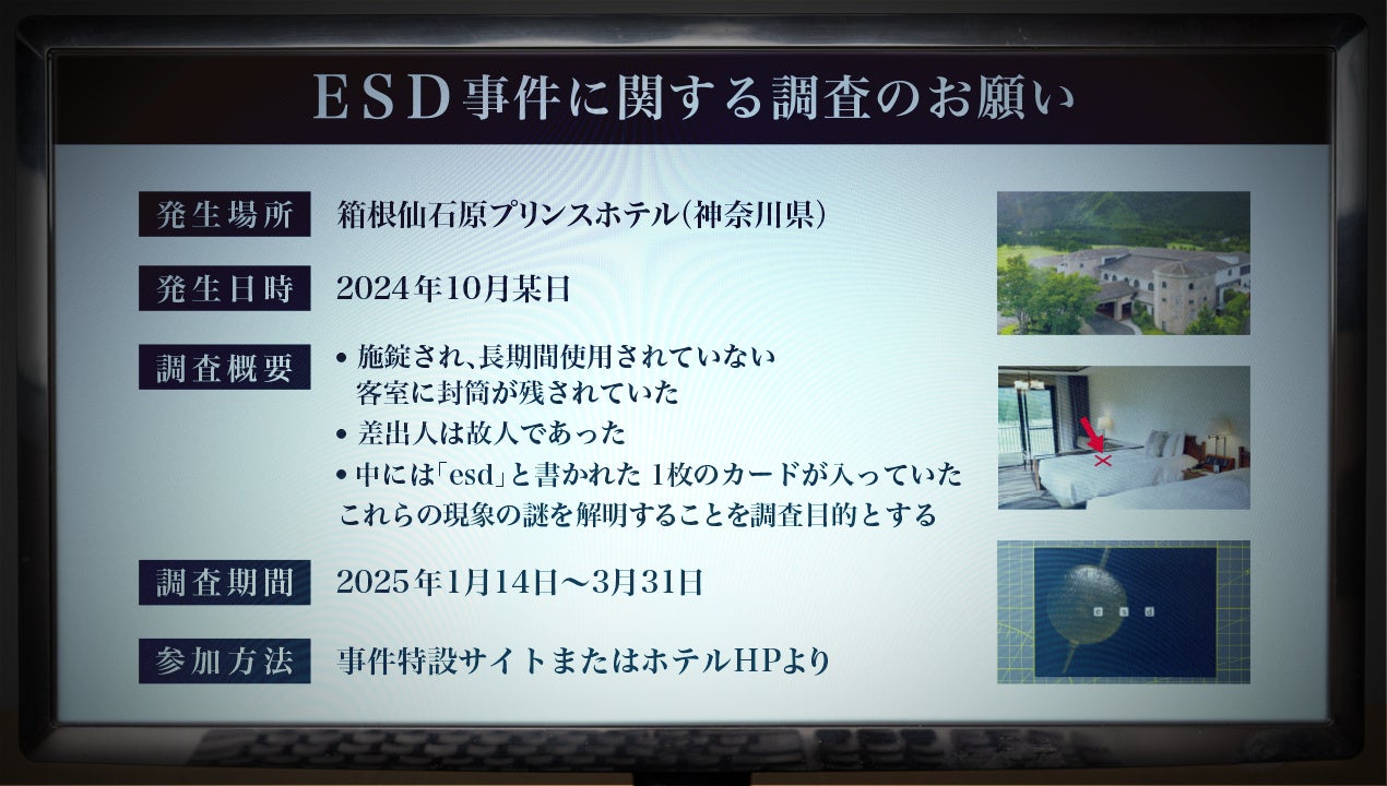 株式会社 謎組(所在地:東京都渋谷区/代表取締役:川和田 直之)は、旅の準備段階から世界観に深く没入する宿泊体験型ゲームイベント「ESD事件に関する調査のお願い」を、2025年1月14日(火)から箱根仙石原プリンスホテル(所在地:神奈川県足柄下郡)で開催します。2013年の初演以降、同ホテルでのイベント開催は18回目となります。前回2024年の開催時には参加者の満足度平均9.2点(10点満点中)の評価をいただきました。
