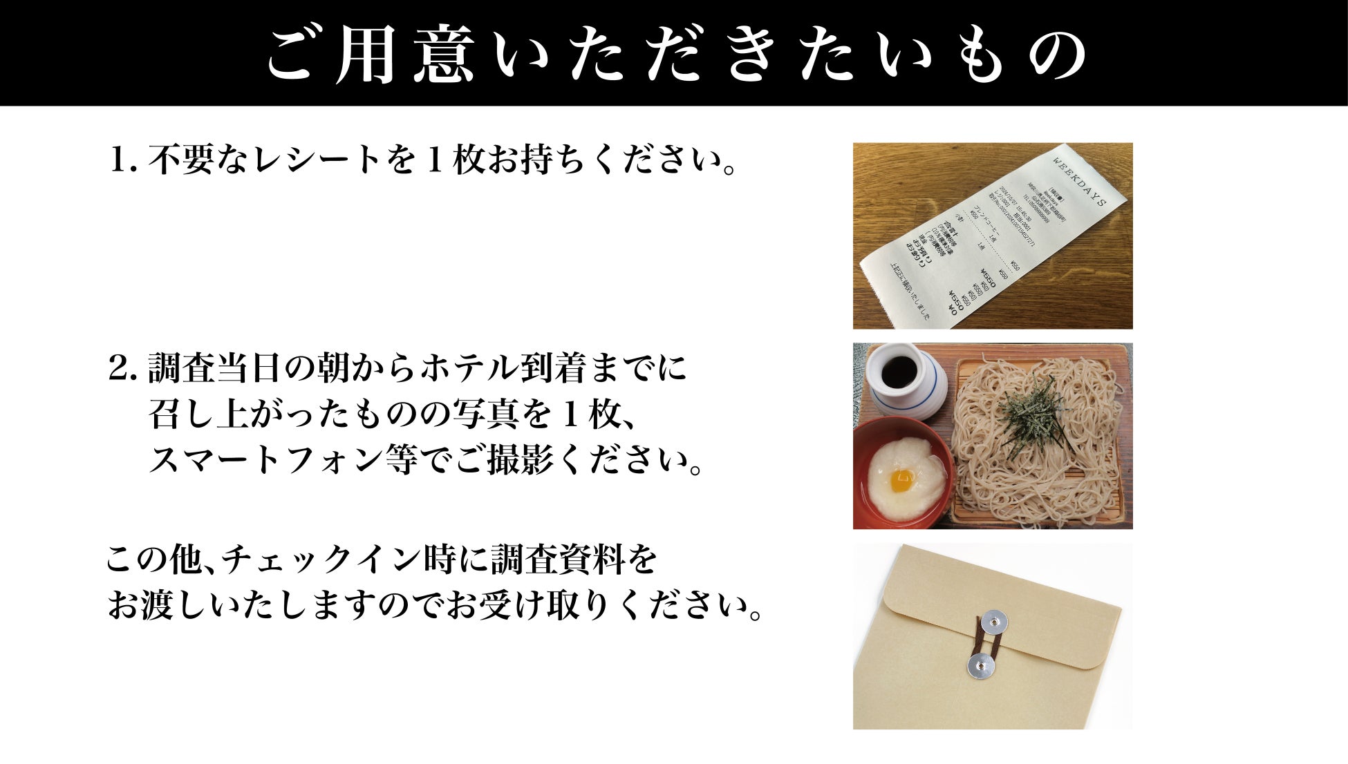 本イベントは、参加者が荷造りをする段階や、自宅を出てからホテルに到着するまでの間にも、事件の謎を解く鍵となる体験が組み込まれた”没入型旅行体験”になっております。そのため、イベントの参加者は調査の開始前に、以下2点を用意する必要があります。