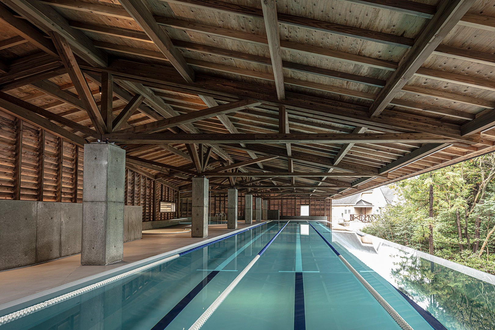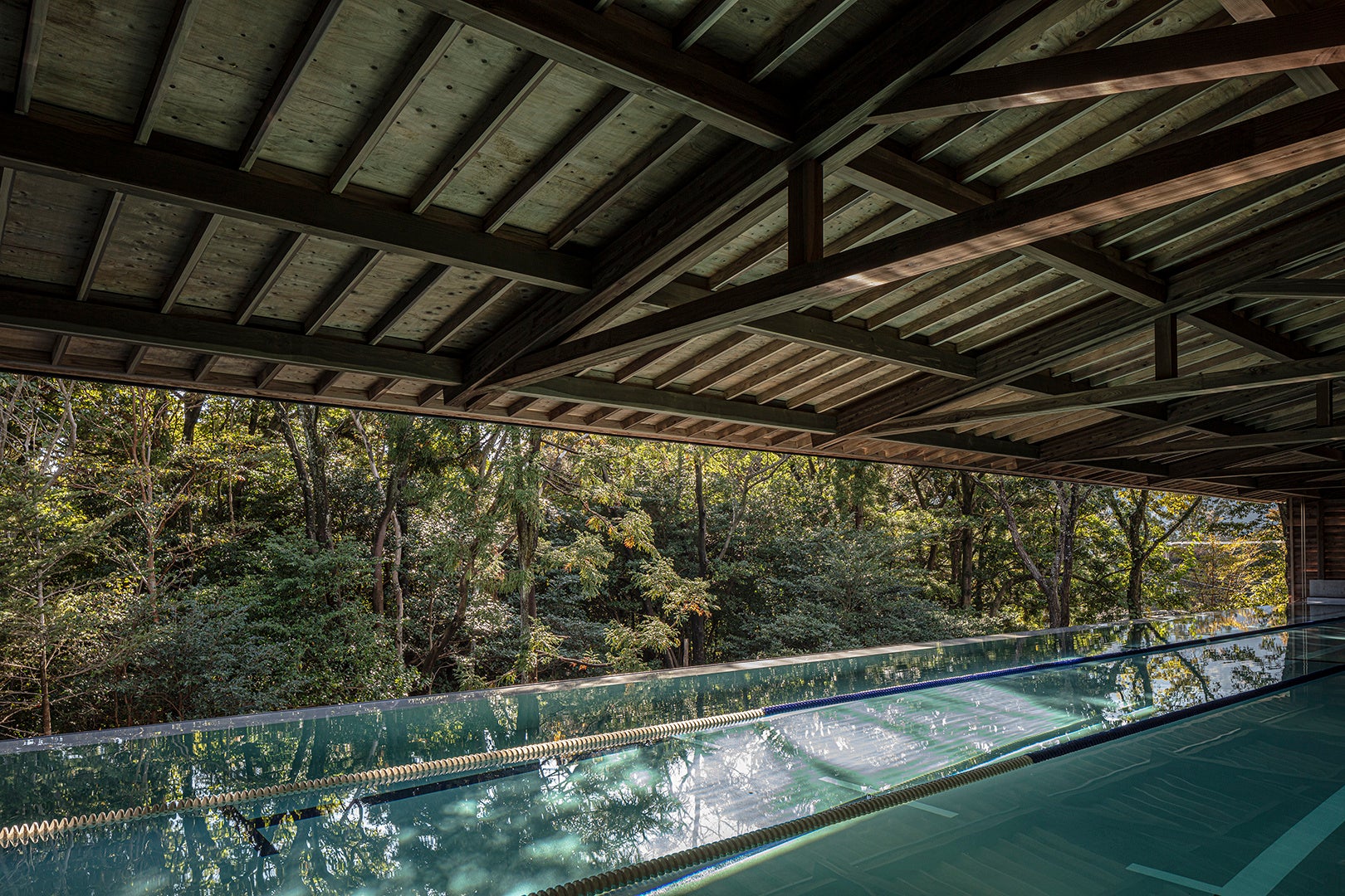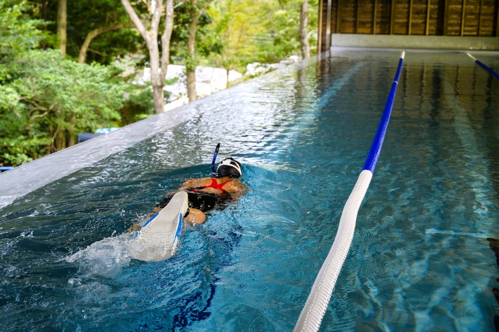 自然光の入る屋根付き25m×3レーンの温水スイミングプール。マスク、シュノーケル、フィンを装着可能天候に左右されずダイビングのプール講習を行うことが可能森と風を感じられるインフィニティプール
