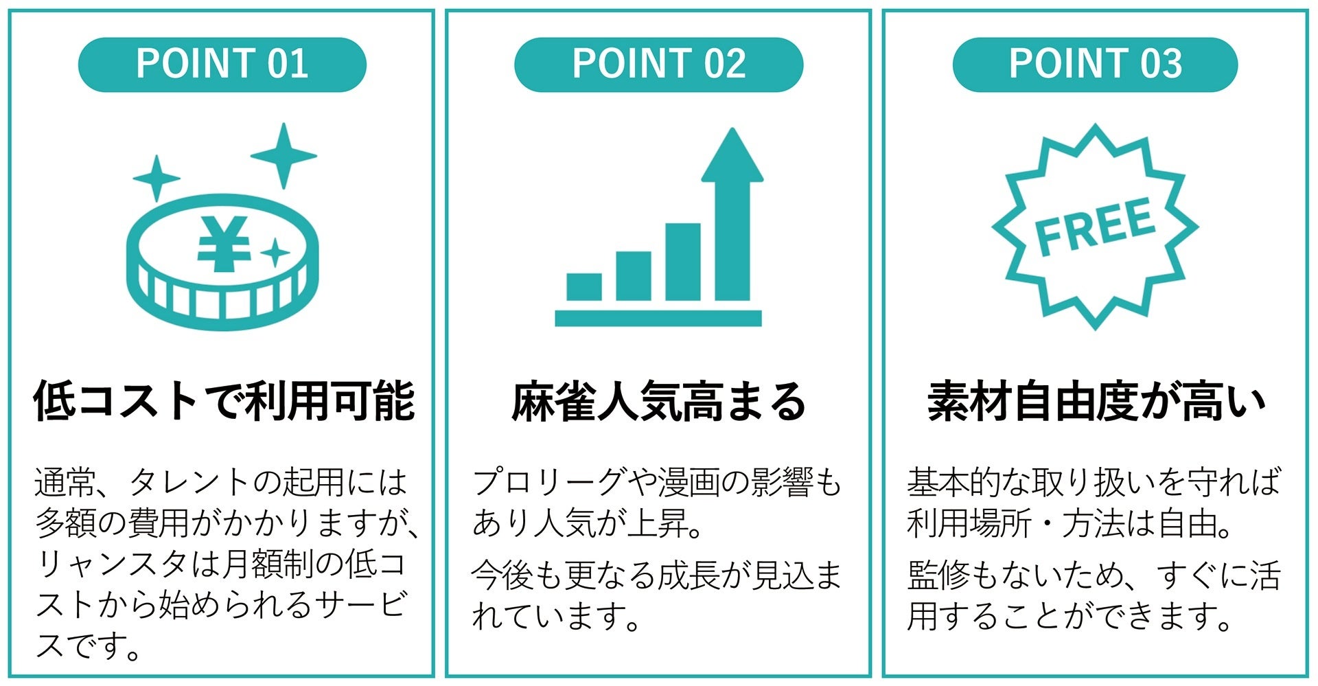 リャンスタの提供素材は、スタンダード素材とオリジナル素材の2パターンがあり、スタンダード素材は契約企業共通の素材で、1人のプロ雀士に対し、画像素材(約80点)、音声素材(約100点)、動画素材(約10点)を提供しています。