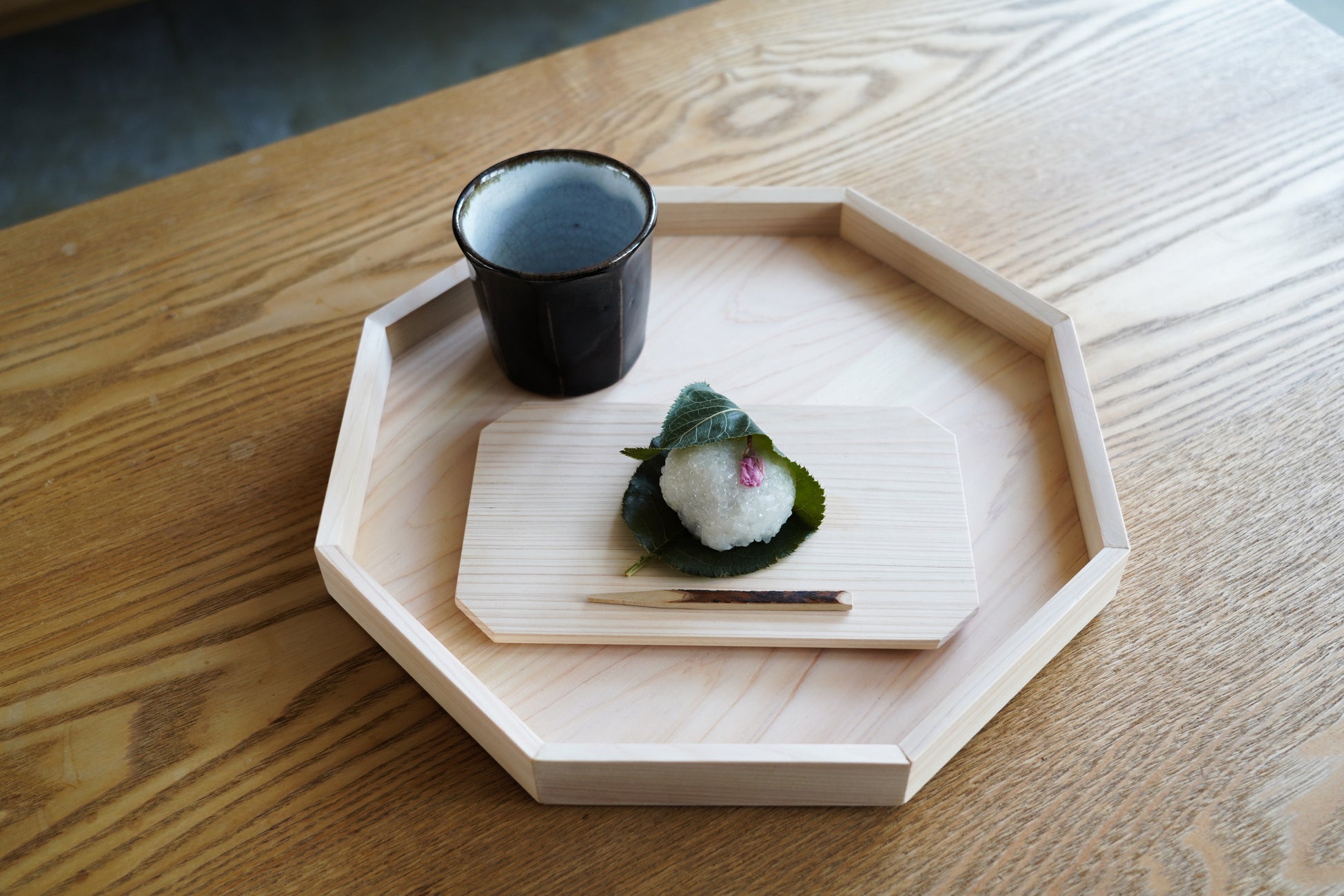 ヒノキの木目が美しいオイル仕上げのお盆です。持ち上げる、運ぶという所作に合わせて縁には手掛けを施し、底面にできる陰影が佇まいのよさを際立たせます。