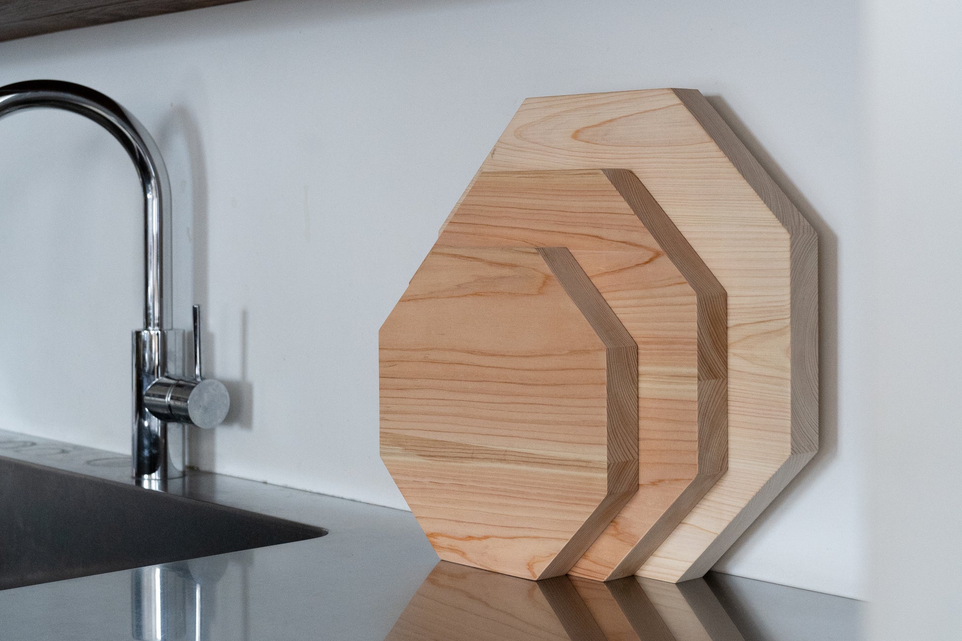 大阪を拠点に活動するクリエイティブユニットgrafがデザインし、和歌山の職人の手により丁寧に製作されています。長い歳月を生きてきた木々を末広がりの「八」を想起させるかたちにし、大切な節目に寄り添う縁起物として皆様の暮らしにお届けします。使い手の他者をもてなす心づかいを引き立てるプロダクトを目指しました。