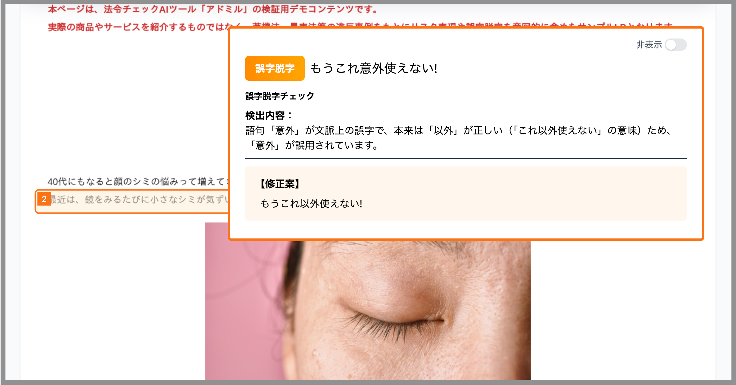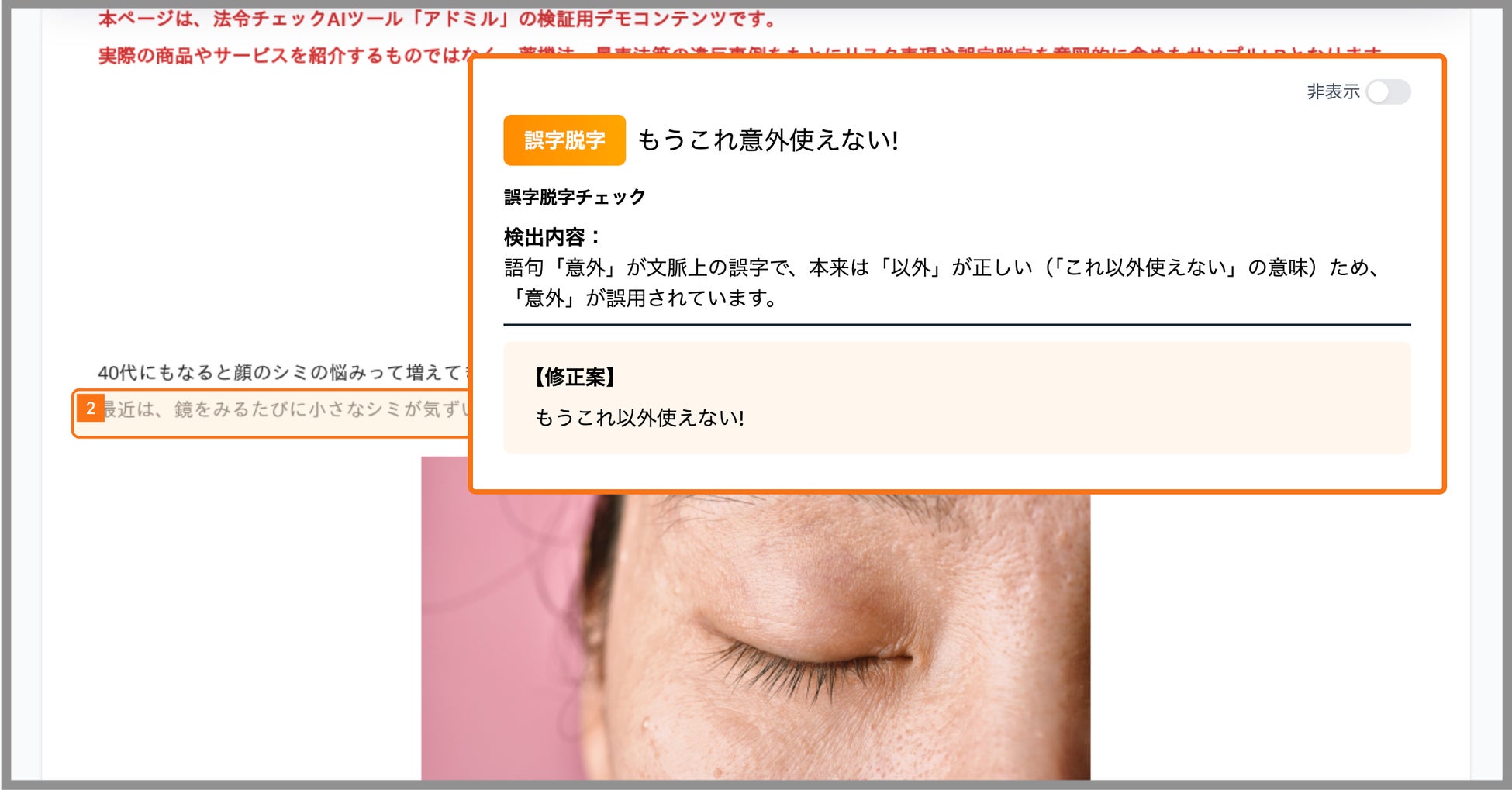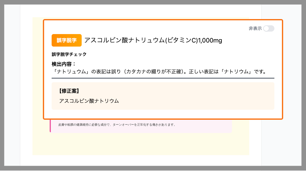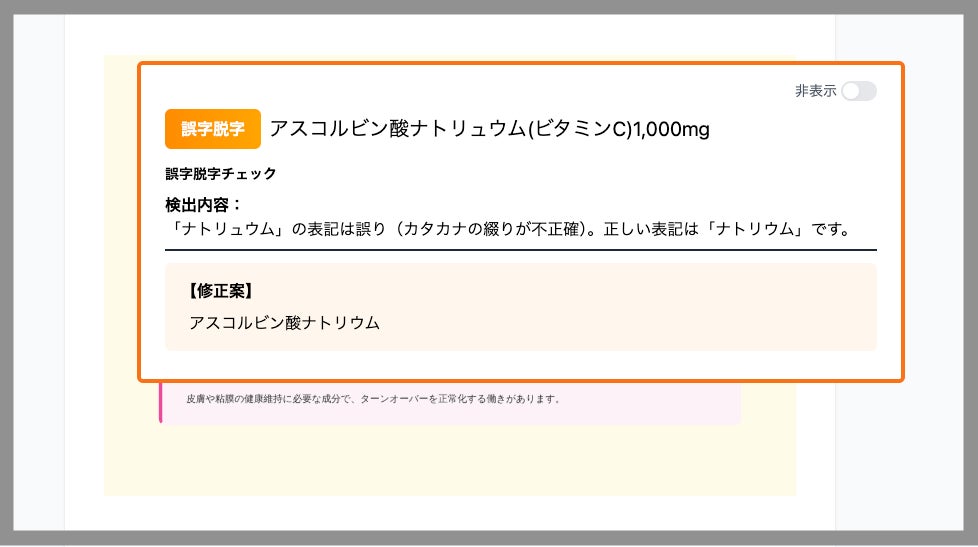 一方で、誤字脱字や変換ミスなどの単純なミスが広告審査やブランド信頼性に影響するケースも多く、利用企業様から「法令チェックと同時に表記のミスも検知したい」というご要望が寄せられていました。