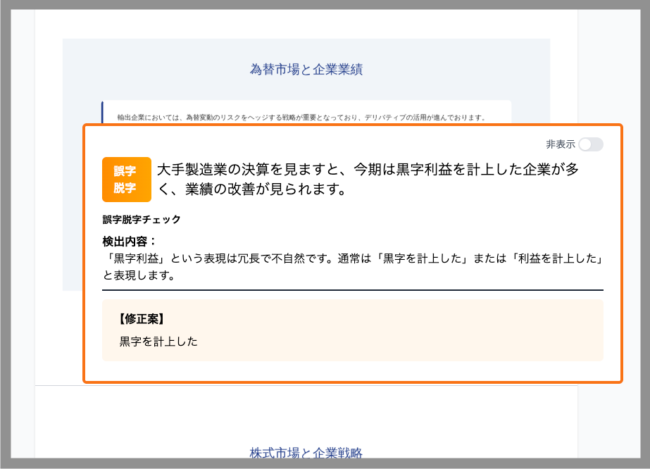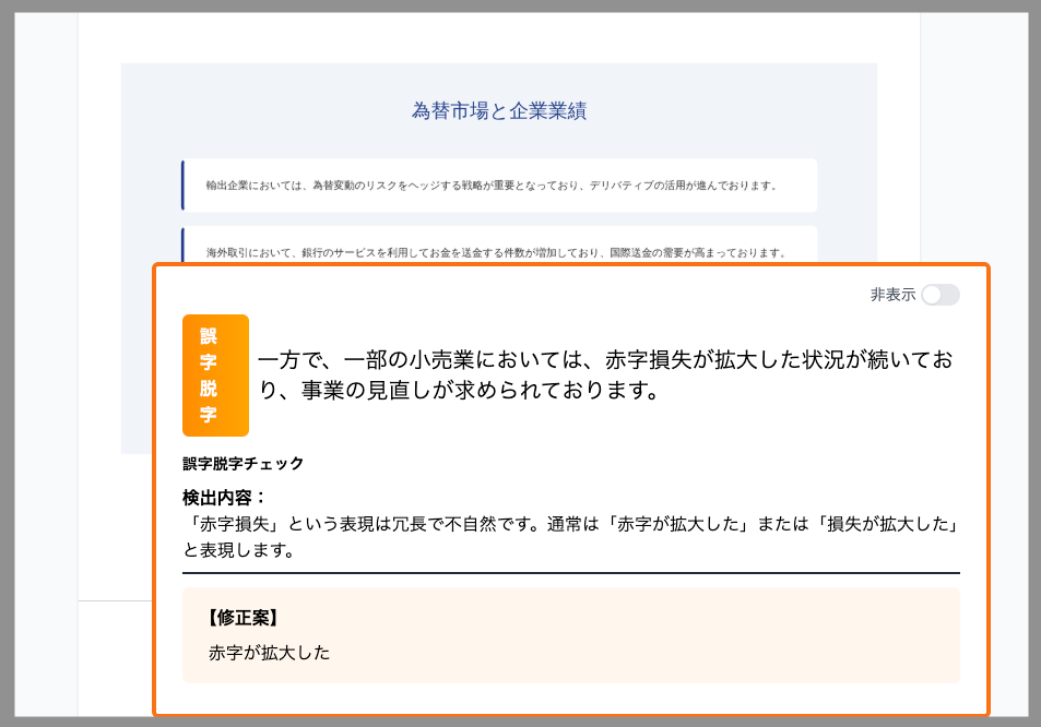 修正候補の自動提案:検出箇所に対し、正しい表記や自然な言い回しを提案。