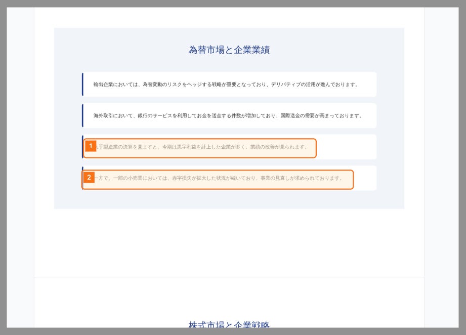 「大手製造業の決算を見ますと、今期は黒字利益を計上した企業が多く、業績の改善が見られます。」と「一方で、一部の小売業においては、赤字損失が拡大した状況が続いており、事業の見直しが求められております。」という冗長表現に対しての指摘