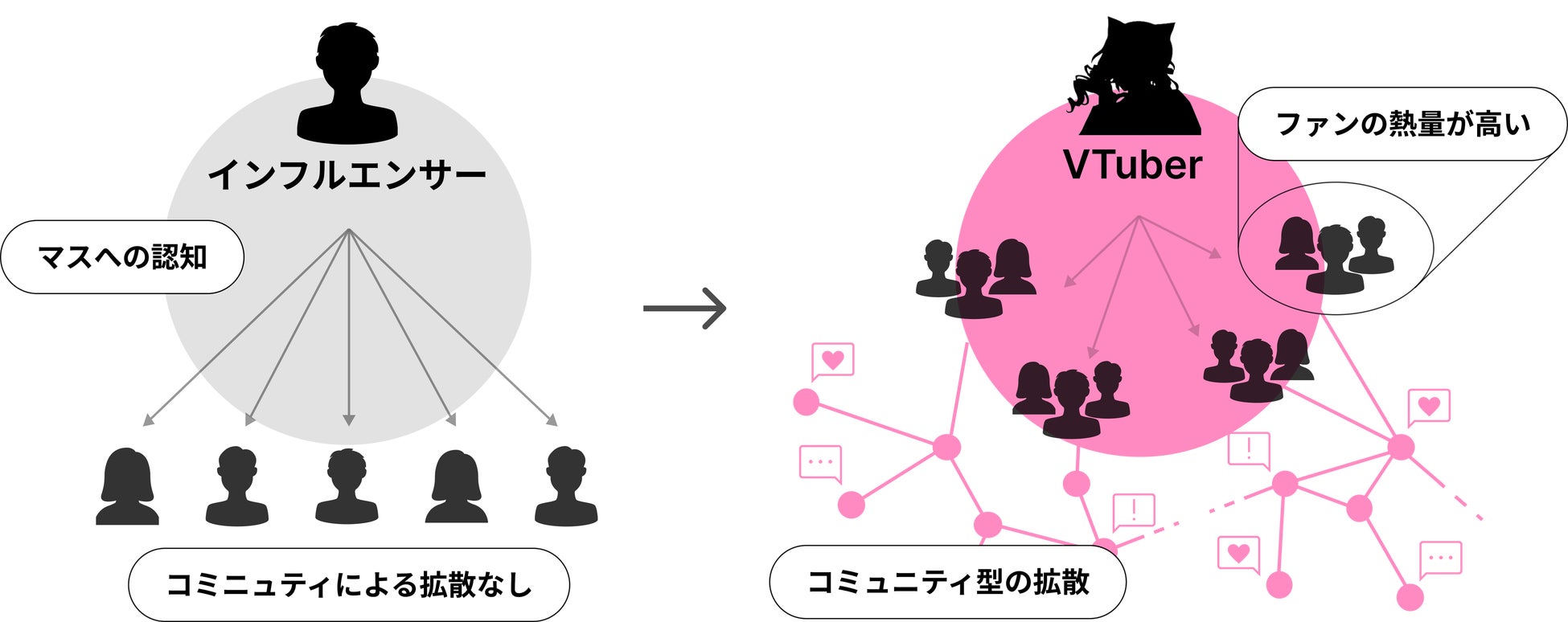 従来のインフルエンサーマーケティングと比較して、VTuberのファンは関心度が高く、コミュニティでの情報拡散力も期待できます。