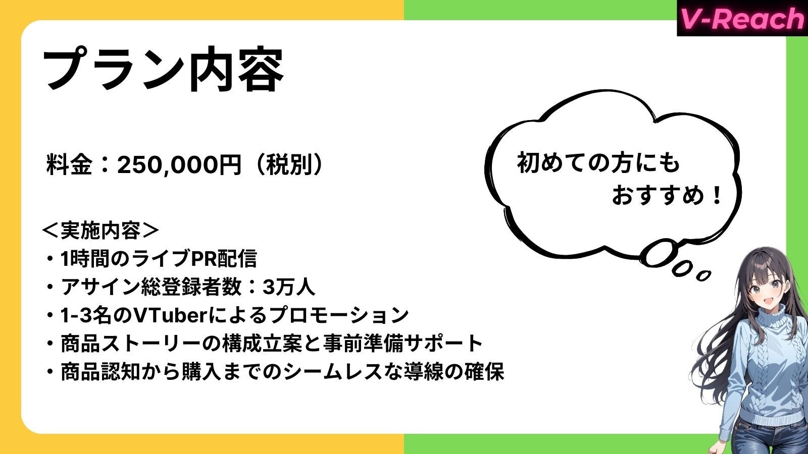 弊社独自の手法により、商品の持つ本来の価値をVTuberが魅力的に伝えることで、視聴者の心に深く刻まれる商品PRを実現します。