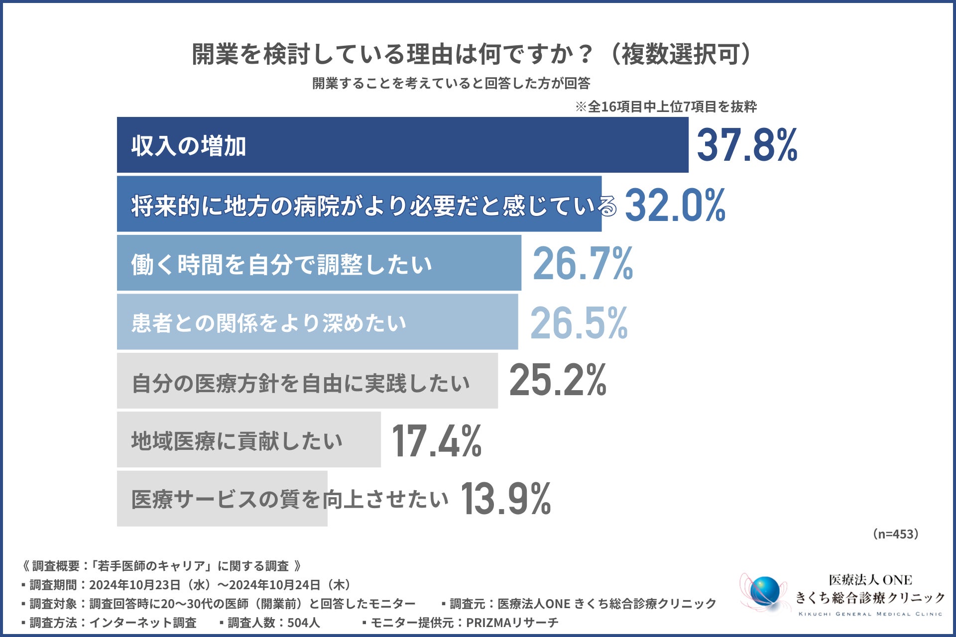 収入面に加え、少子高齢化や過疎地域の増加に伴う地方医療充実の必要性を感じて、開業を視野に入れている方が多いようです。