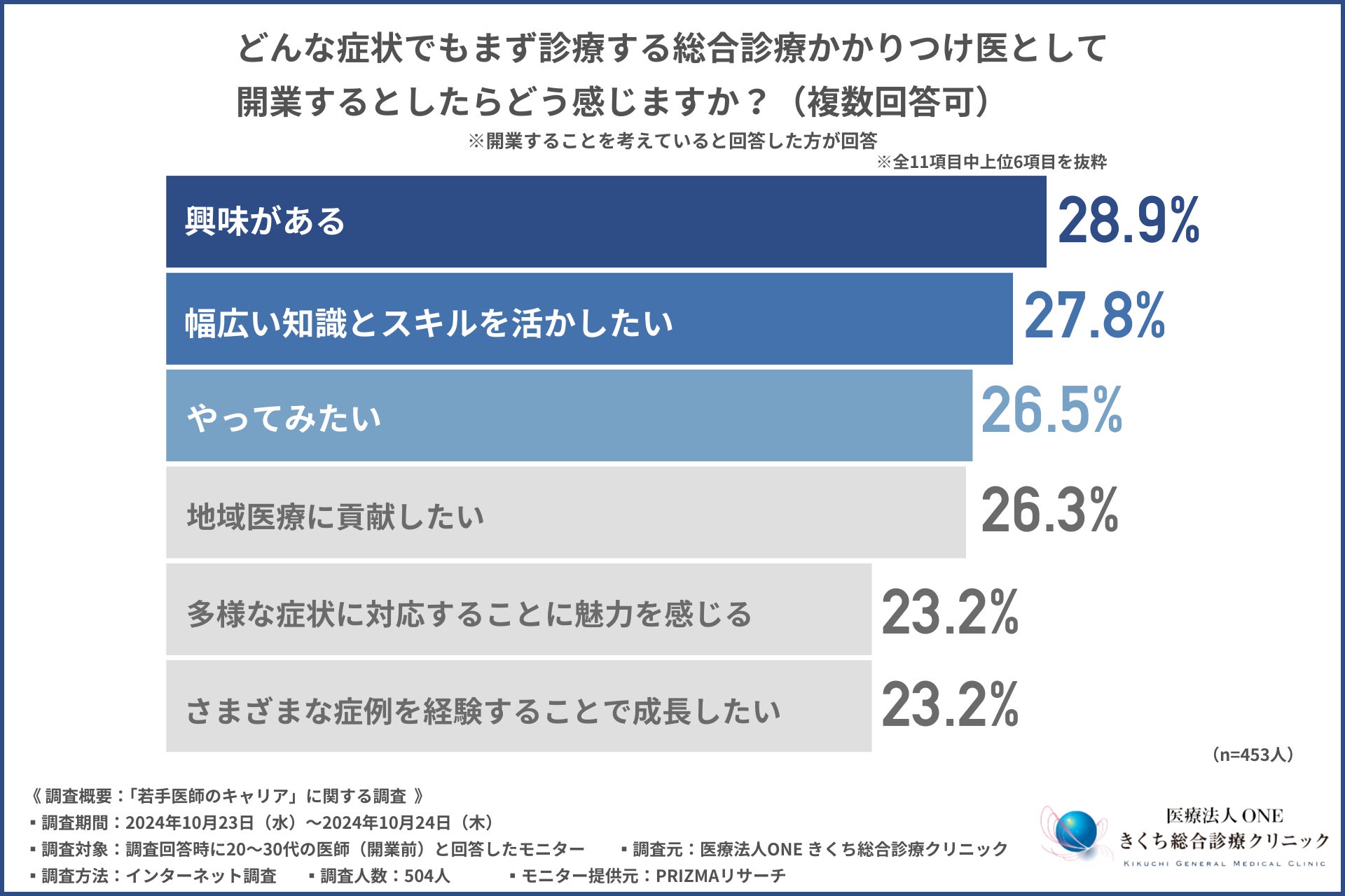 最後に、「どんな症状でもまず診療する総合診療かかりつけ医として開業するとしたらどう感じますか?(複数選択可)」と質問したところ、『興味がある(28.9%)』と回答した方が最も多く、次いで『幅広い知識とスキルを活かしたい(27.8%)』『やってみたい(26.5%)』となりました。